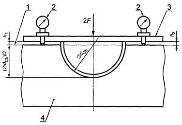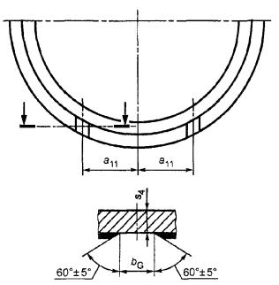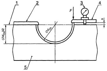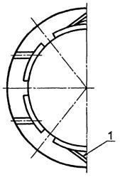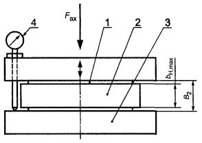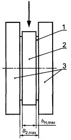 Рисунок 16 - Форма канавки на поверхности бурта Примечание - Карман может быть закрытым или открытым относительно наружного диаметра бурта Рисунок 17 - Форма кармана на поверхности бурта 6 Данные для определения длины развертки6.1 Расчет контрольной нагрузки F Для вкладышей со стальной основой контрольную нагрузку F, Н (с точностью до ближайших 500 Н, но не более 100000 Н), на плоскости разъема для определения выступания h в контрольном блоке с внутренним диаметром dCh (обычно равным максимальному диаметру корпуса) рассчитывают по формуле: F = 100Аcal. (3) Уменьшенную площадь поперечного сечения Аcal (расчетное значение) тонкостенного вкладыша с буртом или без бурта, мм2, рассчитывают по формулам: для материалов сталь/свинцовый сплав, сталь/оловянистый сплав Аcal = (B1 или B2)s1; (4) для материала сталь/медный сплав Аcal = (B1 или B2)(s1 + s2/2); (5) для материала сталь/алюминиевый сплав Аcal = (B1 или B2)(s1 + s2/3). (6) В зависимости от формы, расположения и типа изготовления смазочные канавки могут убавлять уменьшенную площадь поперечного сечения Аcal. Если соотношение свыше 10 %, то его учитывают при расчете. Примечание - В зависимости от размера наружного диаметра тонкостенного вкладыша рекомендуют использовать либо контрольный метод А (см. рисунок 18), либо контрольный метод В (см. рисунок 19) согласно ГОСТ ИСО 6524. При использовании контрольного метода В контрольную нагрузку F прикладывают к каждой плоскости разъема (см. рисунок 19). Общая приложенная нагрузка составляет 2F. 1 - базовая поверхность; 2 - неподвижный упор; 3 - измерительный прибор с круговой шкалой; 4 - нажимная плита; 5 - контрольный блок Рисунок 18 - Контрольный метод А для контрольной нагрузки F = 6000 Н 1 - базовая поверхность; 2 - измерительный прибор с круговой шкалой; 3 - нажимная плита, 4 - контрольный блок Рисунок 19 - Контрольный метод В для контрольной нагрузки F = 6000 Н (общая нагрузка 2F = 12000 Н) 7 Данные для контроля осевой ширины В2 тонкостенных буртовых вкладышейМетод контроля и контрольную нагрузку устанавливают по согласованию между потребителем и изготовителем. 7.1 Проход между двумя параллельными пластинами Измерительный блок вставляют между буртами цельного или сборного тонкостенного буртового вкладыша, при этом указанный вкладыш должен свободно проходить между двумя неподвижными пластинами (рисунок 20). 1 - цельный или сборный тонкостенный буртовый вкладыш; 2 - измерительный блок; 3 - неподвижные пластины Рисунок 20 - Эталонный контроль в свободном состоянии для цельных или сборных тонкостенных буртовых вкладышей 7.2 Контроль осевой ширины B2 под нагрузкой Измерительный блок вставляют между буртами сборного тонкостенного вкладыша, при этом осевую ширину вкладыша контролируют при осевой нагрузке Fax (рисунок 21). 1 - сборный тонкостенный буртовый вкладыш; 2 - измерительный блок; 3 - неподвижная пластина; 4 - индикатор Примечание - Нагрузка Fax равна площади поверхности бурта, помноженной на 1 Н/мм2 Рисунок 21 - Пример контрольного оборудования ПРИЛОЖЕНИЕ А