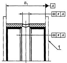 1 - профиль тонкостенного буртового вкладыша Примечание - Для x допуск см. таблицу 3. Рисунок 15 - Расположение смазочной канавки и смазочного отверстия