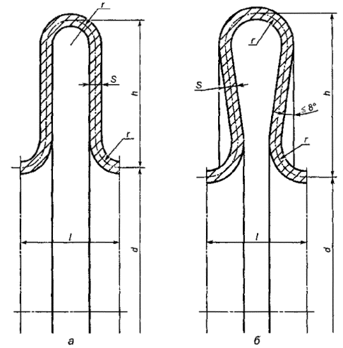 (Поправка, ИУС № 12-2005). 4.5 Расчеты на прочность действительны при условии полностью проваренных окружных сварных швов (рисунок 2). Размер углового сварного шва а (рисунок 2в) должен быть 0,7s. 4.6 Расчетные формулы, приведенные в разделе 5, применимы при условии, если расчетная температура не превышает значений, при которых возникает ползучесть материалов, т.е. при температуре, когда допускаемое напряжение определяется в соответствии с ГОСТ 14249 только по пределу текучести или временному сопротивлению (пределу прочности). Если нет точных данных, то формулы применимы при условии, что расчетная температура стенки компенсатора не превышает, °С: 380 - из углеродистой стали; 420 - из низколегированной стали; 525 - из аустенитной стали. 5 Расчет напряжений в компенсаторе5.1 При расчете напряжений в компенсаторе при действии внутреннего или наружного избыточного давления в формулы (1) - (6) подставляют толщину стенки компенсатора с учетом коррозии и технологических прибавок, а при расчете жесткости компенсатора - толщину стенки компенсатора без учета коррозии и технологических прибавок. 5.2 Определение эквивалентных напряжений 5.2.1 Максимальные эквивалентные напряжения в компенсаторе в зависимости от геометрических параметров возникают в зоне тороидального радиуса на стороне большего диаметра компенсатора или в зоне тороидального радиуса на стороне меньшего диаметра компенсатора. 5.2.1.1 Максимальные эквивалентные напряжения при действии внутреннего (наружного) давления sV(P) определяют по формуле 5.2.1.2 Максимальные эквивалентные напряжения при осевом перемещении одной волны компенсатора sV(W) рассчитывают по формуле 5.2.2 Средние окружные напряжения sит рассчитывают по формуле Примечание - Необходимые