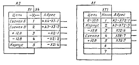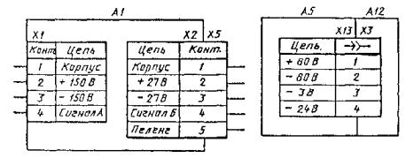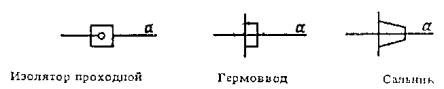 Черт. 21 Черт. 22 Черт. 22. (Новая редакция, Изм. № 3). 4.15. На схеме изделия, в состав которого входят многоконтактные элементы, линии, изображающие жгуты (кабели - многожильные провода, электрические шнуры, группы проводов), допускается доводить только до контура графического обозначения элемента, не показывая присоединения к контактам. Указания о присоединении проводов или жил кабеля (многожильного провода, электрического шнура) к контактам приводят в этом случае одним из следующих способов; у контактов показывают концы линий, изображающих провода или жилы кабеля (многожильного провода, электрического шнура), и указывают их обозначения. Концы линий направляют в сторону соответствующего жгута, кабеля (многожильного провода, электрического шнура), группы проводов (черт. 23); у изображения многоконтактного элемента помещают таблицу с указанием подключения контактов. Таблицу соединяют линией-выноской с соответствующим жгутом, кабелем, (многожильным проводом, электрическим шнуром) группой проводов (черт. 24). Черт. 23 Черт. 24 а - линия, изображающая провод (группу проводов, жгут, кабель - многожильный провод, электрический шнур) Черт. 25 Проходные изоляторы, гермовводы, сальники изображают в виде условных графических обозначений, приведенных на черт. 25. 4.14 - 4.16. (Измененная редакция, Изм. № 2). 4.17. На схеме следует указывать обозначения вводных элементов, нанесенные на изделие. Если обозначения вводных элементов не указаны в конструкции изделия, то допускается условно присваивать им обозначения на схеме соединений, повторяя их в соответствующей конструкторской документации. При этом на поле схемы помещают необходимые пояснения. Провода, жгуты, кабели (многожильные провода, электрические шнуры) следует нумеровать отдельно. При этом провода, входящие в жгут, нумеруют в пределах жгута, а жилы кабеля (многожильного провода, электрического шнура) - в пределах кабеля (многожильного провода, электрического шнура). Примечания: 1. Допускается сквозная нумерация всех проводов и жил кабелей (многожильных проводов, электрических шнуров) в пределах изделия. 2. Допускается сквозная нумерация отдельных проводов, жгутов и кабелей (многожильных проводов, электрических шнуров) в пределах изделия. При этом провода, входящие в жгут, нумеруют в пределах жгута, а жилы кабеля (многожильного провода, электрического шнура) - в пределах кабеля (многожильного провода, электрического шнура). 3. Допускается не обозначать жгуты, кабели (многожильные провода, электрические шнуры) и отдельные провода, если изделие, на которое составляют схему, войдет в комплекс и обозначения жгутам, кабелям (многожильным проводам, электрическим шнурам) и проводам будут присвоены в пределах всего комплекса. 4. Допускается присваивать обозначения группам проводов. 4.19. Если на принципиальной схеме электрическим цепям присвоены обозначения в соответствии с ГОСТ 2.709-89, то всем одножильным проводам, жилам кабелей (многожильных проводов, электрических шнуров) и проводам жгутов присваивают те же обозначения. При этом жгуты и кабели (многожильные провода, электрические шнуры) обозначают в соответствии с требованиями п. 4.18. (Измененная редакция, Изм. № 3). Буквенное (буквенно-цифровое) обозначение проставляют перед обозначением каждого провода, жгута, кабеля (многожильного провода, электрического 