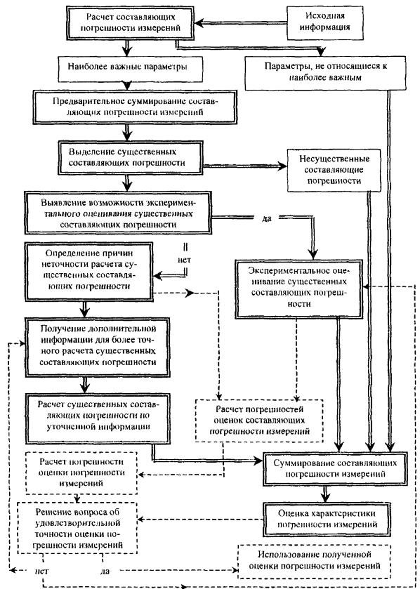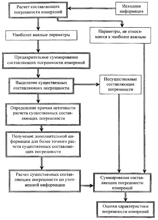 Эти условия целесообразно использовать, когда номинальное значение измеряемого технологического параметра равно или близко к 0. 2.4. Если погрешность оценки погрешности измерений не удовлетворяет условиям, приведенным в п.п. 2.1 - 2.3, то решение об использовании такой оценки погрешности измерений может быть принято при незначительных возможных экономических потерях или других неблагоприятных последствиях из-за погрешности измерений. 3. АЛГОРИТМ ОЦЕНИВАНИЯ ПОГРЕШНОСТИ ИЗМЕРЕНИЙ (рис. 1).3.1. Расчет составляющих погрешности измерений выполняется на основе исходной информации в соответствии с рекомендациями приложения 2. Результаты расчета целесообразно выразить в виде границ составляющих относительной погрешности либо абсолютной погрешности в единицах измеряемой величины. В качестве примера в приложении 3 приведены некоторые варианты измерительных каналов ИИС и АСУТП, типичные условия измерений и доли составляющих погрешности измерений, соответствующие компонентам измерительных каналов и внешним влияющим величинам. 3.2. Для параметров, не относящихся к наиболее важным, производится суммирование составляющих, в результате чего получают оценку границы погрешности измерений. Типичные способы суммирования составляющих погрешности измерений (при ограниченной исходной информации) приведены в приложении 4. 3.4. Для существенных составляющих погрешности измерений наиболее важных параметров необходимо выявить возможность их экспериментального определения. Экспериментальное оценивание составляющих погрешности измерений может быть осуществлено достаточно корректно, если имеется возможность измерять с необходимой точностью величины на входе и выходе средств измерений и задавать типичные комбинации значений внешней влияющей величины и измеряемой величины на входе в условиях эксплуатации средств измерений. (Методические составляющие погрешности измерений параметров обычно оцениваются аналитически). Рис. 1 Экспериментальное определение существенных составляющих погрешности измерений при выполнении указанных условий может дать более точные оценки по сравнению с расчетом. Точность экспериментального оценивания составляющих погрешности измерений может быть принята удовлетворительной, если погрешность оценки не превышает 30 % от самой оценки. 3.5. Для существенных составляющих погрешности измерений наиболее важных параметров, которые не могут быть достаточно корректно определены экспериментально, целесообразно выявить причины неточности расчета границ составляющих погрешности из-за неполноты исходных данных и принятых в этой связи допущений, получить дополнительную информацию и произвести новый расчет. Например, при расчете составляющей погрешности измерений давления, вызванной изменениями температуры воздуха, окружающего датчик, установленный вне помещения, были приняты границы изменения температуры воздуха от - 40 до + 30 °С (согласно таблицы 4 ГОСТ 16350-70 [6] для холодного климатического района). Дополнительный анализ результатов измерений гидрометеослужбой по данной местности, где установлены датчики, показал, что граничные значения изменений температуры воздуха от - 25 до + 25 °С. Эти значения и использованы в окончательном расчете погрешности измерений давления. 3.6. Оцененные расчетным или эксперимент