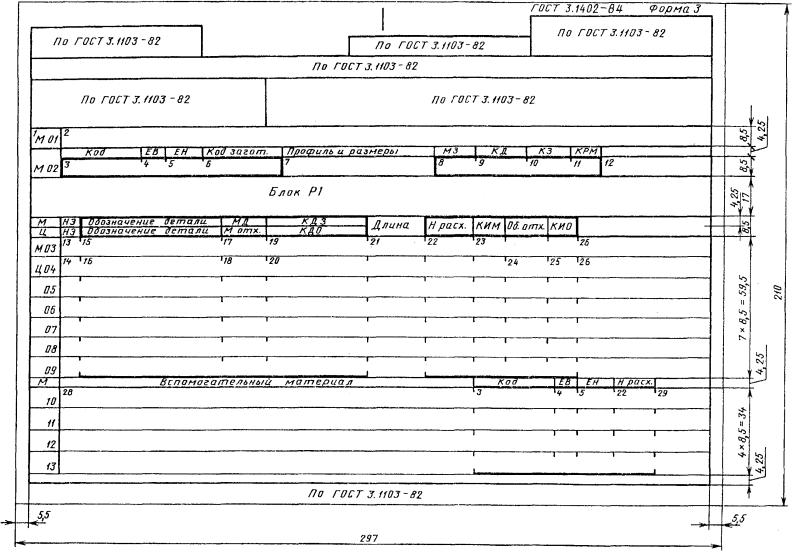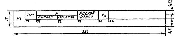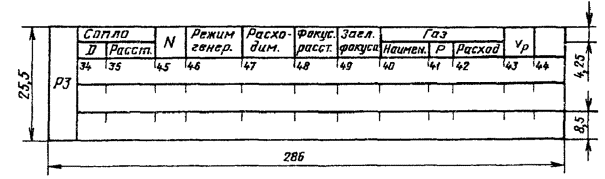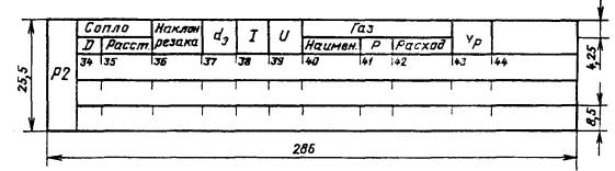 1.4.1. Правила применения служебных символов установлены в ГОСТ 3.1118-82. 1.5. В форме КТИ раскроя материалов термической резкой установлена зона со служебным символом Р, в блоки которой следует записывать информацию о режимах термической резки материалов. В зависимости от способа термической резки в форму КТИ необходимо включать следующие блоки: - Р1 (черт. 1) - для кислородной и кислородно-флюсовой резки. При включении блока Р1 форме КТИ следует присваивать номер 3 и наименование: «КТИ кислородной и кислородно-флюсовой резки материалов». Черт. 1 - Р2 (черт. 2) - для плазменно-дуговой, воздушно-дуговой и дуговой резки. При включении блока Р2 форме КТИ следует присваивать номер 4 и наименование: «КТИ плазменно-дуговой, воздушно-дуговой и дуговой резки материалов». Черт. 2 - Р3 (черт. 3) - для лазерной резки. При включении блока Р3 форме КТИ следует присваивать номер 5 и наименование: «КТИ лазерной резки материалов». Черт. 3 Включение блоков Р2 или Р3 в форму КТИ раскроя материалов термической резкой следует производить за счет уменьшения количества строк со служебными символами М и Ц. 1.6. ВДО (формы 6 и 6а) следует применять для указания данных о деталях, изготовленных из отходов материала. 1.7. Графы форм КТИ и ВДО следует заполнять в соответствии с табл. 2. Таблица 2