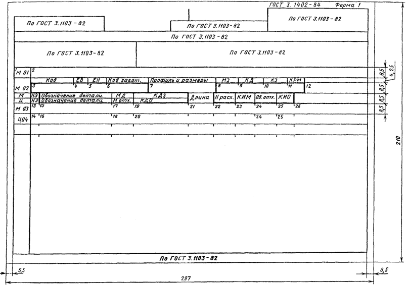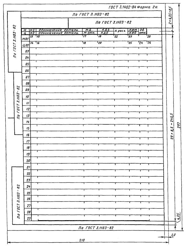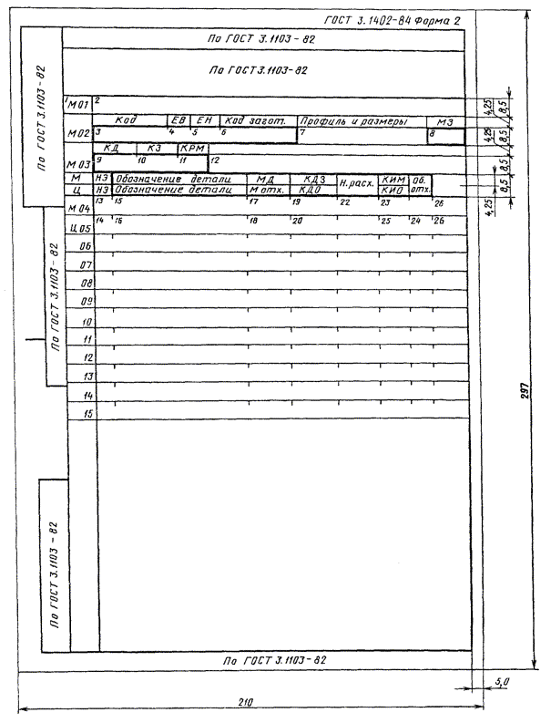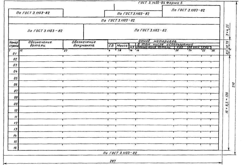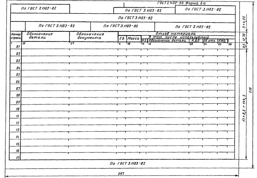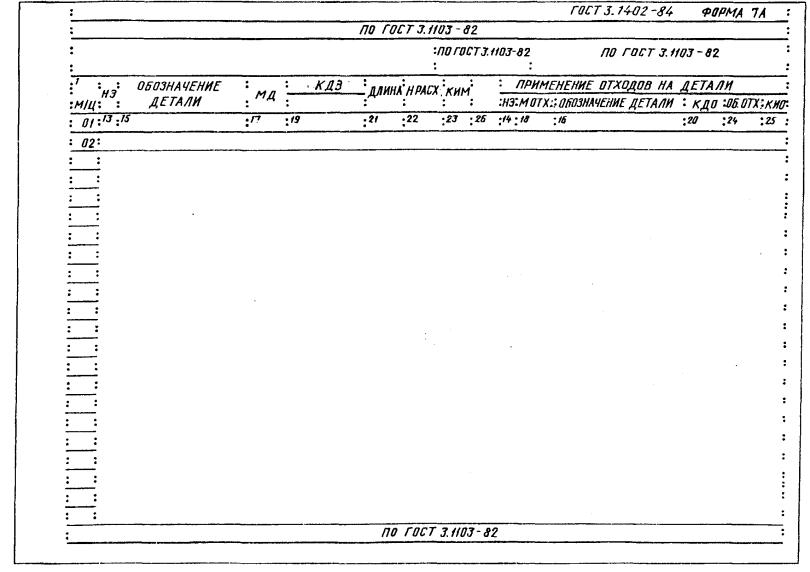 Постановлением Государственного комитета СССР по стандартам от 18 декабря 1984 г. № 4506 дата введения установлена 01.01.86 Настоящий стандарт устанавливает виды, формы, правила оформления и комплектность следующих технологических документов (далее - документов), применяемых при различных методах проектирования единичных, типовых и групповых технологических процессов (операций) раскроя материалов на заготовки или детали (далее - раскроя материалов): - карты технологической информации раскроя материалов механической обработкой; - карты технологической информации (КТИ) раскроя материалов термической резкой (кислородной, кислородно-флюсовой, плазменно-дуговой, воздушно-дуговой, дуговой и лазерной); - ведомости деталей, изготовленных из отходов (ВДО). 1. ФОРМЫ И ПРАВИЛА ОФОРМЛЕНИЯ КТИ И ВЕДОМОСТИ ДЕТАЛЕЙ, ИЗГОТОВЛЕННЫХ ИЗ ОТХОДОВ1.1. Формы КТИ при описании технологических процессов (далее - процессов) раскроя материалов применяют совместно с маршрутными картами (МК) - формы 2, 4, 6, 1а, 1б, 3а, 3б и 5а по ГОСТ 3.1118-82. Допускается применение МК (формы 1, 3 и 5) в случае описания в МК операций других методов обработки, например штамповки, механической обработки резанием, с операциями раскроя материалов. 1.2. Формы КТИ применяют для указания информации дополнительно к имеющейся в МК, где описывают действия, выполняемые в технологической последовательности операций (переходов), указывают данные по средствам технологического оснащения и трудозатратам. 1.3. В зависимости от способов раскроя материалов следует применять следующие формы КТИ: - 1 и 1а или 2 и 2а - для раскроя материалов механической обработкой; - 3, 3а, 4, 5 - для раскроя материалов термической резкой (кислородной, кислородно-флюсовой, плазменно-дуговой, воздушно-дуговой, дуговой и лазерной). 1.3.1. При автоматизированном проектировании документов с использованием максимальной значности печатаемых символов (до 128) алфавитно-цифровых печатающих устройств (АЦПУ) ЭВМ допускается изменять ширину формата документов до 332,8 мм (при шаге печатающих устройств, равном 2,6 мм). Изменять ширину формата документов следует за счет изменения размеров граф: 12 и 26 - для форм 1 и 1а; 12, 26, 29 и 44 - для форм 3, 3а, 4 и 5; 26 - для форм 6 и 6а. Формам документов, предназначенным для автоматизированного проектирования, следует присваивать обозначения тех же форм документов, которые применяют при неавтоматизированном проектировании. Пример построения форм 7 и 7а для САПР ТП приведен в приложении 1. 1.4. Графы форм КТИ следует заполнять построчно с привязкой к соответствующим служебным символам, указанным в табл. 1. Таблица 1