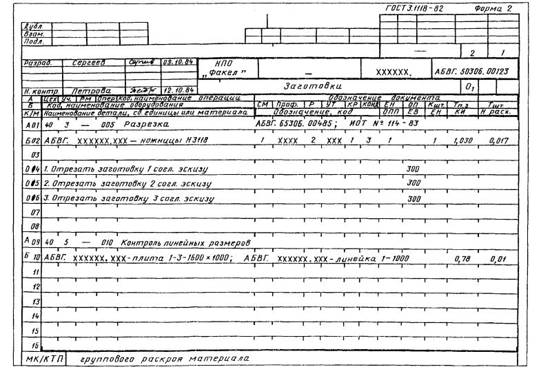 Примечания: 1. В графе «Количество знаков» указано число знаков, соответствующих размеру ширины данной графы. Максимальное количество знаков, вносимых в графы, на один знак меньше числа знаков, указанных в таблице. 2. *Размеры указаны для граф блока Р2, входящих в форму 4. ** Размеры указаны для граф блока Р3, входящих в форму 5. Размер графы 43 указан для форм 3, 4 и 5. 3. Для документов, заполняемых рукописным способом, размеры граф допускается округлять до ближайшего целого числа. 4. Размеры граф даны исходя из шага печатающих устройств, равного 2,6 мм. 1.9.1. Разделение граф следует производить вертикальными отрезками прямой линии длиной 0,5-1,5 мм. При автоматизированном проектировании разделение граф по вертикали и разделение строк по горизонтали следует выполнять наборами соответствующих символов по ГОСТ 27464-87. Примечания: 1. Допускается разделять графы сплошной вертикальной линией на всю ширину строки. 2. При автоматизированном проектировании допускается разделение строк по горизонтали не производить. 2. ПРАВИЛА КОМПЛЕКТАЦИИ И ОФОРМЛЕНИЯ КОМПЛЕКТОВ ДОКУМЕНТОВ НА ПРОЦЕССЫ РАСКРОЯ МАТЕРИАЛОВ2.1. Комплектность документов на процессы раскроя материалов зависит от вида разрабатываемых процессов по их организации, от применяемых способов раскроя материалов и устанавливается разработчиком документов в соответствии с требованиями ГОСТ 3.1119-83 при разработке единичных технологических процессов (ЕТП) и ГОСТ 3.1121-84 при разработке типовых (групповых) технологических процессов (ТТП, ГТП). 2.2. В комплектах документов на процессы раскроя материалов основными документами, применяемыми для описания операций, являются формы МК, установленные ГОСТ 3.1118-82. Формы МК могут выполнять функции следующих документов: - карты технологического процесса (КТП) - при разработке единичных технологических процессов; - карты типового технологического процесса (КТТП) - при разработке типовых (групповых) технологических процессов; - операционной карты (ОК) - при описании операций ЕТП; - карты типовой операции - при описании операций в ТТП (ГТП); - карты технологической информации - при разработке КТИ для указания переменной информации о заготовке или детали. В целях отражения действительного назначения формы МК в графе 28 блока Б6 основной надписи по ГОСТ 3.1103-82 на первом листе следует через дробь проставить условное обозначение того документа, функции которого он выполняет, например: при выполнении функции КТТП - МК/КТТП; « « « КТП-МК/КТП; « « « ОК-МК/ОК; « « « КТО-МК/КТО; « « « КТИ-МК/КТИ. 2.3. В зависимости от степени детализации описания процессов следует применять маршрутное, маршрутно-операционное и операционное описание процессов раскроя материалов. 2.3.1. При маршрутном описании все операции процессов раскроя материалов следует описывать в технологической последовательности, кратко, без указания переходов. В этом случае графическое изображение эскиза раскроя материала допускается выполнять на нижней зоне поля формы МК или на карте эскиза. 2.3.2. Маршрутно-операционное описание процессов раскроя материалов применяют в случае описания отдельных операций кратко, без указания переходов (например в МК), и описания других операций процесса в операционном описании. 2.3.3. Операционное описание процессов раскроя материалов применяют в случае описания всех операций процесса с ука