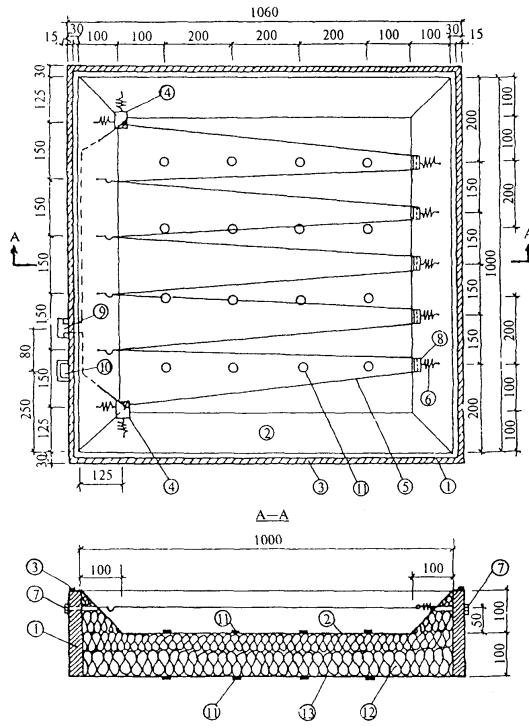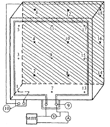 разности средних температур в климатической камере ± 5 %, в натурных условиях ± 15 %. 10 Оценка погрешности измеренийТочность определения среднего теплового потока q через ограждающую конструкцию зависит от точности измерений напряжения V и силы тока I нагревателя и разности температур поверхности стенок прибора Dtс = tci - tce. Оценку погрешностей измерений выполняют согласно ГОСТ 8.207 для каждого из замеров вышеуказанных величин по приложению Г. Доверительные границы eq случайной погрешности среднего теплового потока q для каждого из замеров определяют по формуле eq =± [(eVeI)/Aс + eDtc/Rc], (5) где eV, eI и eDtc - соответственно доверительные границы случайной погрешности измерений напряжения V, тока I нагревателя и разности температур Dtс поверхностей стенок нагревателя, определяемые по приложению Г. 11 Требования безопасности11.1 При работе с оборудованием климатических камер и при проведении натурных испытаний должны соблюдаться требования безопасности в соответствии с ГОСТ 27570.0. 11.2 Монтаж датчиков на наружной поверхности ограждающей конструкции на этажах выше первого должен проводиться с лоджий, балконов или монтажных средств при соблюдении требований безопасности при работе на высоте. ПРИЛОЖЕНИЕ А(справочное) Конструкция прибораПрибор представляет собой ящик с одной открытой поверхностью, стенки которого утеплены эффективным теплоизоляционным материалом, облицованным внутри отражающим излучение материалом. В зависимости от испытываемой конструкции выбирают размер ящика прибора. Конструкции прибора размером 1,0 ´ 1,0 м и 0,5 ´ 0,5 м приведены на рисунках А.1 и А.2. Ящик изготовляют из листового материала. Изнутри стенки утепляют минеральной ватой 12, которую закрывают снаружи листовым отражающим материалом 2: толстой алюминиевой фольгой или жестью с зеркальным покрытием. По периметру ящика на торце боковых стенок 1 крепят резиновый уплотнитель 3. На поверхностях отражателя и задней стенки ящика 13 крепят спаи 11 батарей дифференциальных термопар, схема соединения которых приведена на рисунке А.3. Для подключения к измерительному прибору батарея термопар снабжена клеммами 10. В полости прибора, образованной отражателем 2, крепят спираль нагрева 5 из нихромовой проволоки через трубчатые керамические изоляторы 8 к пружинам 6, фиксируемым на боковых стенках ящика с помощью крепежных элементов 7. На концах спирали закреплены изоляторы 4, через которые подключают провода ввода электропитания нагревателя, клеммы 9 которого располагают на боковой стенке ящика. Выбор проволоки и ее длины для нагревателя прибора, подключенного к источнику постоянного тока, осуществляют в следующем порядке. Диапазон сопротивления теплопередаче Rо наиболее распространенных ограждений - 0,5-4,5 м2×°С/Вт. Исходя из габаритов прибора устанавливают диапазон необходимой мощности нагрева Р, Вт, по формуле P = [(tint - text)/Ro)]Aс, (А.1) где tint - температура воздуха с теплой стороны испытываемой конструкции (внутреннего воздуха), °С, ожидаемая в период испытаний; text - температура воздуха с холодной стороны испытываемой конструкции (наружного воздуха), °С, ожидаемая в период испытаний; Ас - площадь прибора, ограниченная уплотнительной прокладкой, прижимаемой к испытываемой конструкции, м2. По паспортным данным источника постоянного тока выявляют диапазоны создаваемого напряжения V, В, и си
