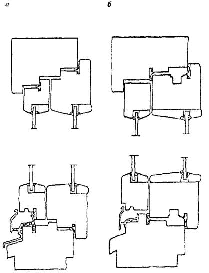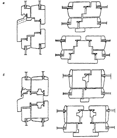 а - вариант конструкции с распашным открыванием створок, с двумя контурами прокладок в наружной и внутренней створках; б - вариант конструкции с поворотно-откидным открыванием створок, с двумя контурами прокладок во внутренней створке и коробке, с алюминиевым дождезащитным профилем Рисунок 2 - Примеры конструктивных решений оконных блоков спаренной конструкции на базе коробки по ГОСТ 24700 (импостные и безимпостные притворы)