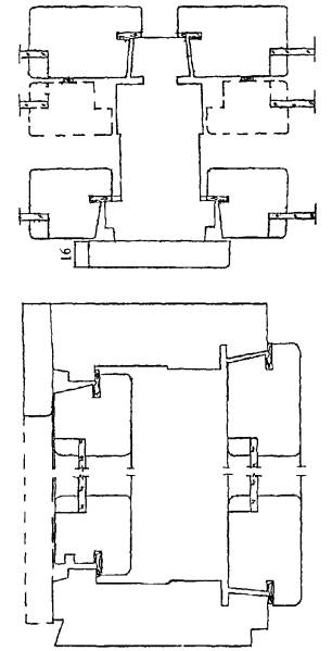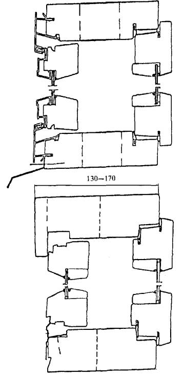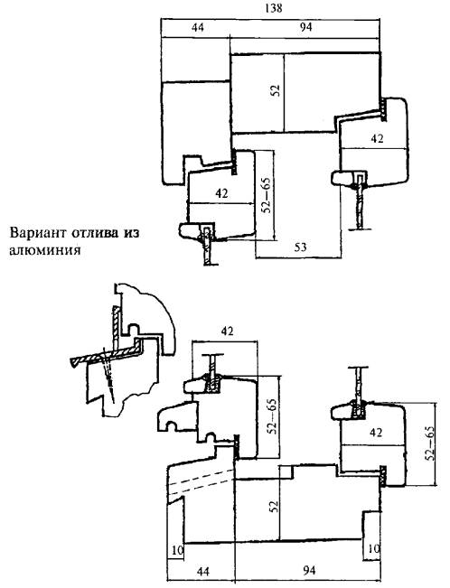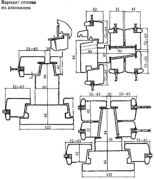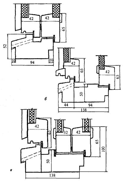 Рисунок 3 - Примеры конструктивных решений оконных блоков спаренной конструкции (с распашным открыванием створок, двумя рядами уплотняющих прокладок, наплав толщиной 16 мм - под ввертную петлю)