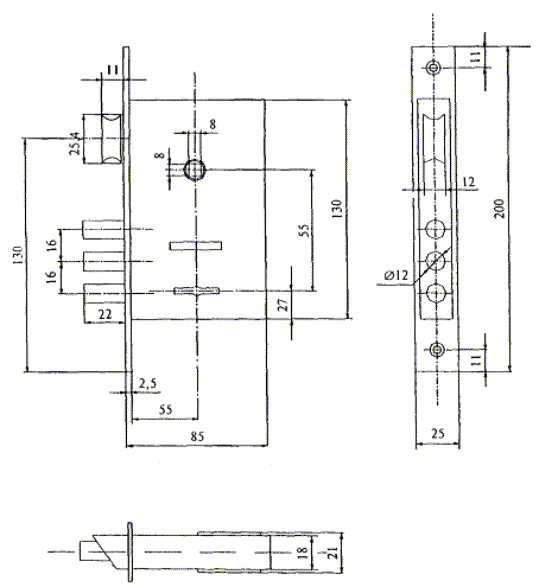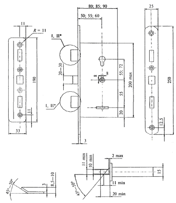 Рисунок В.13 - Пример замка врезного цилиндрового (типы ЗВ5) или сувальдного (ЗВ10) с прямым засовом и роликом
