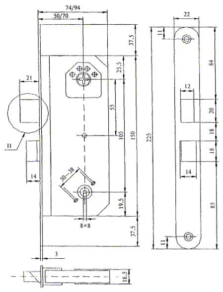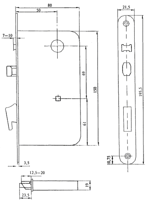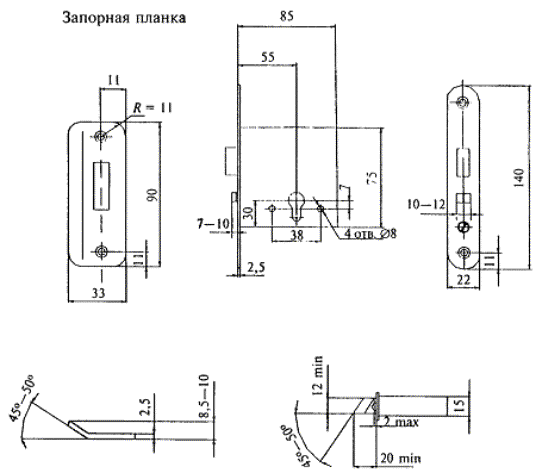 Рисунок В.10 - Пример замка врезного цилиндрового типа ЗВ7 с прямоугольным засовом и защелкой