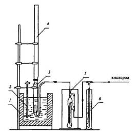 1 - термостат; 2 - механическая мешалка; 3 - прибор для испытания антикоррозионных свойств масел; 4 - холодильник, 5 - реометр; 6 - водяной регулятор давления. Рисунок 2 - Схема установки для проведения испытания Испытания антикоррозионных свойств одной пробы масла проводят в трех параллельно установленных приборах. В каждый чистый сухой реакционный сосуд берут навеску испытуемого масла (30±0,1) г. Затем в масло опускают отшлифованную вымытую стальную пластинку, взвешенную на аналитических весах с погрешностью до 0,0002 г, подсоединяют воздушный холодильник. Перед началом опыта верхний конец холодильника закрывают небольшим тампоном из ваты во избежание попадания загрязнений. Сосуд помещают в термостат, нагретый до 95 °С, и подсоединяют резиновую трубку, подающую кислород (расход кислорода 30 см3/мин). С этого момента отсчитывается время испытаний. Через 30 мин после начала испытания в реакционный сосуд добавляют дистиллированную воду в количестве 3 см3, приподнимая для этого воздушный холодильник. Приборы выдерживают при 95 °С при непрерывном пропускании кислорода в течение 30 ч, включая первые 30 мин, в течение которых испытания проводили в отсутствии воды. 4 ОБРАБОТКА РЕЗУЛЬТАТОВ4.1 По окончании испытаний сосуды вынимают из термостата, холодильники отсоединяют. Стальные пластины вынимают из приборов, удаляя с них остатки масла фильтровальной бумагой. При слабой коррозии масло остается прозрачным, следы коррозии на пластине незначительны и распределены неравномерно по ее поверхности. В случае сильной коррозии масло становится темным и мутным, содержит осадок, пластина покрыта коррозионными отложениями по всей поверхности. 4.2 Продукты коррозии счищают со всех поверхностей пластин, включая торцевые, с помощью мягкой канцелярской резинки (ластика). Затем очищенные пластины промывают бензином, спиртом и сушат между листами фильтровальной бумаги. Подготовленные таким образом пластины взвешивают, определяя их массу с погрешностью не более 0,0002 г. Операцию повторяют до тех пор, пока результаты двух последовательных взвешиваний пластин будут иметь расхождение не более 0,0004 г. 4.3 Степень коррозии стали (Хк) в граммах на квадратный метр металла (для принятого времени испытания 30 ч) рассчитывают по формуле