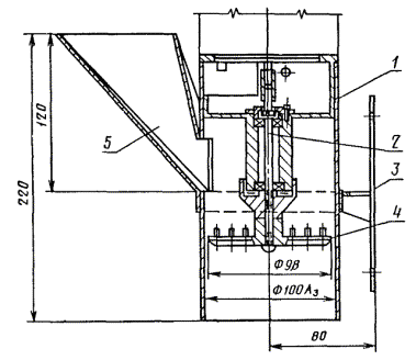 (Измененная редакция, Изм. № 1, 2). ПРИЛОЖЕНИЕ 2Рекомендуемое ОПИСАНИЕ МЕХАНИЧЕСКОГО РЫХЛИТЕЛЯРыхлитель (см. чертеж) состоит из цилиндрического корпуса 1 диаметром 100 мм, в верхней части которого имеется бункер 5 для загрузки фторопласта-4. Внутри цилиндра на валу 2 укреплен диск-рыхлитель 4 с шипами. Диск приводится во вращение электродвигателем. Скорость вращения диска 3000 об/мин. Рыхлитель крепится на кронштейне 3. Материал рыхлителя - нержавеющая сталь. Фторопласт-4 подают небольшими порциями на вращающийся диск рыхлителя и сквозь зазор между корпусом и диском он ссыпается в виде порошка в тару-приемник. ПРИЛОЖЕНИЕ 3Рекомендуемое МЕТОД КОНТРОЛЯ «ТЕМНОЙ ПОЛОСЫ» НА ОБРАЗЦАХ ИЗ ФТОРОПЛАСТА-4Настоящий метод устанавливает правила контроля «темной полосы» на образцах из фторопласта-4. Интенсивность окраски слоев заготовки из фторопласта-4 после ее выпечки, определяемая в виде «темной полосы» на поверхности заготовки после ее строжки до наружного диаметра (60,00 ± 0,25) мм характеризует однородность материала. Сущность метода контроля «темной полосы» на заготовках из фторопласта-4 состоит в сравнении интенсивности окраски заготовки, получаемой ею в процессе термообработки, с образцами, утвержденными в установленном порядке. 1. Аппаратура 1.1. Контроль «темной полосы» производят на лабораторном фотоэлектрическом индикаторном приборе типа ИТП-2 или ИТП-3, действие которого основано на интегральном измерении интенсивности отраженного света в видимой области спектра от поверхности контролируемых образцов фторопласта-4. Прибор типа ИТП-2 или ИТП-3 состоит из выносного щупа (датчика), электронного блока и пенала с образцами А и Б, утвержденными в установленном порядке. Прибор содержит вакуумный сурьмяно-цезиевый фотоэлемент типа СЦВ-51, измерительный усилитель на полупроводниковых триодах типа TН-1 и МП-115 со стабилизированным источником питания постоянного тока и микроамперметр типа М-24. (Измененная редакция, Изм. № 1). 1.2. Основные технические характеристики прибора 1.2.1. Пределы измерения от минус 25 до плюс 25 делений к установленному посередине шкалы нулевому делению, соответствующему образцу А. Отклонение стрелки прибора при установке более светлого образца Б составляет (14 ± 2) деления шкалы. Образец Б применяют для контроля чувствительности шкалы. 1.2.2. Среднее квадратическое отклонение показаний прибора при контроле одного образца составляет не более ± 2 деления. Колебания окружающей температуры от 15 до 25 °С и напряжения сети питания от 200 до 240 В не вносят дополнительной погрешности в измерения. 1.2.3. Время одного измерения - не более 10 с. 1.2.4. При пересмотре действующих образцов А и Б показания прибора при иx контроле изменяются и дополнительно согласовываются между изготовителем и потребителем. 2. Подготовка к испытанию 2.1. Рабочий образец для контроля «темной полосы» изготовляют строжкой заготовки из фторопласта-4 специальным резцом на станке при заданном числе оборотов шпинделя до наружного диаметра (60,00 ± 0,25) мм. Резец затачивают периодически, не реже одного раза в смену. (Измененная редакция, Изм. № 1). 2.2. Перед измерением «темной полосы» поверхность заготовки слегка протирают чистой мягкой хлопчатобумажной тканью для удаления следов обработки, не допуская натирания заготовки до блеска. 2.3. Образцы А и Б периодически, не реже одного р