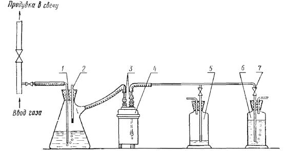 2.1.10. Вместимость калориметрической бомбы вычисляют как среднее арифметическое результатов пяти определений, расхождение между наибольшим и наименьшим значениями которых не должно превышать 0,5·10-6 м3. 2.1.11. Калориметрическую бомбу с полузавинченными вентилями и крышкой бомбы, предназначенную для работы с газом, оставляют всегда с осушающим реактивом на дне стакана. 2.2. Продувка и заполнение калориметрической бомбы испытуемым газом 2.2.1. Продувка и заполнение калориметрической бомбы газом могут осуществляться из любого источника газа: газопровода, газгольдера, пипетки, баллона под давлением и других. Газ из газопровода при избыточном давлении не выше 0,098 МПа (1 ати) и газгольдера отбирают газоотборной трубкой из нержавеющей стали, оборудованной двумя кранами, расположенными за точками отбора пробы, один из которых служит для продувки газоотборной линии в атмосферу в течение такого времени, чтобы сменился 10 - 15-кратный объем газа; другой для отбора газа на испытание. При избыточном давлении в газопроводе выше 0,098 МПа (1 ати) на газоотборной линии перед отбором газа устанавливают редуктор для снижения избыточного давления до 0,0098 - 0,0490 МПа (0,1 - 0,5 ати). При отсутствии подводки газа в помещение лаборатории пробу газа отбирают в металлические двухвентильные пробоотборники под давлением, соответствующим давлению в месте отбора, откуда потом газ вытесняется 22 %-ным раствором хлористого натрия или водой, насыщенной газом. 2.2.2. При продувке из металлических газовых пипеток вместимостью 10 - 12 дм3, изготовленных из устойчивого к окислению металла и снабженных с обоих концов трехходовыми или одноходовыми кранами, напорной склянкой служит склянка с тубусом вместимостью 10 - 20 дм3. 2.2.3. Для заполнения газовой пипетки ее устанавливают в подставке в вертикальном положении, соединяют резиновой трубкой нижний кран пипетки с краном водопровода и заполняют пипетку водой. По заполнении пипетки закрывают оба крана и разъединяют ее с водопроводом. Оставляя заполненную водой пипетку в подставке в вертикальном положении, соединяют ее верхний кран резиновой трубкой со штуцером, ведущим от газопровода или газгольдера, и, поворачивая трехходовой или серповидный кран на атмосферу, продувают соединительную трубку газом. Газопровод должен быть предварительно продут в атмосферу. Установив небольшую струю газа, открывают нижний кран пипетки и заполняют ее газом, постепенно сливая воду из пипетки небольшой струей. Когда вся вода будет удалена, продувают пипетку газом еще в течение 3 - 5 мин, после этого закрывают нижний кран. Не прекращают подачу газа еще в течение 2 - 3 мин, чтобы создать некоторое давление газа в пипетке и этим предохранить от подсоса воздуха в нее извне. Затем закрывают верхний кран пипетки и разъединяют ее с источником газа. Если количество газа не ограничено, то газовую пипетку можно заполнять газом без предварительного заполнения водой, но с предварительной продувкой ее газом в течение 2 ч. 2.2.4. Для продувки и заполнения бомбы газом собирают установку (черт. 2), состоящую из увлажнителя газа 1, представляющего собой колбу для фильтрования под вакуумом вместимостью 1000 - 2000 мл, залитую водой на 70 - 80 мм ее высоты, применяемого для насыщения газа водяными парами; термометра 2 на 50 °С с ценой деления шкалы 0,1 °С; металлических трубок с ниппелями 3