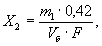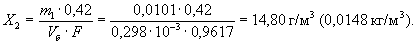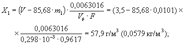где V - объем точно 0,1 н. раствора гидроокиси натрия, израсходованный на титрование смыва бомбы, см3; m1 - масса полученного осадка сернокислого бария, г; 0,011671 - масса сернокислого бария, соответствующая 1 см3 точно 0,1 н. раствора гидроокиси натрия, г; 0,0063016 - масса азотной кислоты, соответствующая 1 см3 точно 0,1 н. раствора гидроокиси натрия, г; Vб - объем газа в бомбе при температуре t и давлении Р, м3; F - коэффициент для приведения объема газа к сухому состоянию и условиям 20 °С и 101,325 кПа вычисляют по п. 4.1.5. (Измененная редакция, Изм. № 2). 3.2.4. Массовую концентрацию серной кислоты в смыве бомбы (Х2), выраженную в г/м3 испытуемого газа, вычисляют по формуле