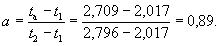 По табл. 2 настоящего стандарта находят z1 = 5; z2 = z - z1 = 20 - 5 = 15. 1.2. Вычисляют средние скорости изменения показания термометра (υ1 и υ2). υ1 = (2,015 - 2,017)/10 = -0,0002; υ2 = (2,796 - 2,791)/10 = 0,0005;