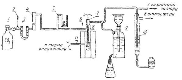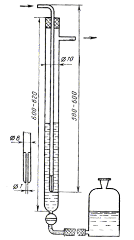 Срок действия с 01.07.90 до 01.01.99 Несоблюдение стандарта преследуется по закону Настоящий стандарт распространяется на высокотемпературный каменноугольный кокс и устанавливает газообъемный метод определения реакционной способности по отношению к диоксиду углерода. Метод основан на газификации кокса диоксидом углерода при температуре 1000°С. Оценку реакционной способности производят по константе скорости реакции. 1. МЕТОД ОТБОРА ПРОБ1.1. Отбор и подготовка пробы кокса - по ГОСТ 23083 и ГОСТ 2669. 1.2. Лабораторную пробу кокса размером кусков 0 - 13 мм и массой 1 кг сокращают до 250 г и высушивают до постоянной массы. Пробу измельчают до размера частиц менее 3 мм, рассеивают на ситах с отверстиями диаметром 3 и 1 мм и хранят в эксикаторе над осушающим веществом. Для проведения анализа используют пробу с размером частиц 1 - 3 мм. Массовую долю общей влаги определяют по ГОСТ 27589, зольность - по ГОСТ 27564. 2. АППАРАТУРА И РЕАКТИВЫТрубка реакционная кварцевая (черт. 1 и 2). 1 - пластинка из дробленого кварца; 2 - проба кокса; 3 - чехол для термопары Черт. 1 1 - проба кокса; 2 - штуцер чехла; 3 - штуцер реакционной трубки; 4 - чехол термопары; 5 - реакционная трубка; 6 - чехол реакционной трубки; 7 - пластинка из дробленого кварца Черт. 2 Черт. 3 Печь электрическая трубчатая длиной 400 мм, внутренним диаметром 45 мм, обеспечивающая устойчивую температуру нагрева в реакционной зоне (1000 ± 5) °С. Терморегулятор автоматический для поддержания температуры анализа. Термопары платинородий-платина типа ТПП-11 по ГОСТ ЗС44. Трубка хлоркалышевая типа ТХ-И-2-250 по ГОСТ 25336 для сушки диоксида углерода. Шкаф сушильный, обеспечивающий устойчивую температуру нагрева (200 ± 5) °С. Термометр для измерения температуры диоксида углерода от 0 до 50 °С с ценой деления Г. Ротаметр типа РМ по ГОСТ 13015. Манометр. Моностат жидкостный для поддержания постоянного давления в системе (черт. 3). Газоанализатор автоматический или ручного типа. Склянка 4 по ГОСТ 25336 для газа при отсутствии автоматического газоанализатора. Баллон стальной по ГОСТ 949 с редукционным вентилем для СО2. Углерода диоксид сжиженный по ГОСТ 8050, 99% -ной чистоты. Весы лабораторные общего назначения 2-го класса точности с наибольшим пределом взвешивания 200 г по ГОСТ 24104. Допускается применение других весов с аналогичными метрологическими характеристиками. Кальций хлористый по ТУ 6-09-4711-81 или ангидрон. Натрий хлористый по ГОСТ 4233, насыщенный раствор и водный раствор хлористого кальция, с массовой концентрацией 0,1 г/см3, смешанные в соотношении 1:1, или другая жидкость, не поглощающая СО2 (воду применять нельзя). Калия гидроокись по ГОСТ 24363, водный раствор с массовой долей 30%. 3. ПОДГОТОВКА К АНАЛИЗУУстановку собирают по схеме, приведенной на черт. 4. Длина пути продуктов реакции от реакционной трубки до газоанализатора должна быть по возможности минимальной. Предварительно подготовленную сухую пробу кокса массой 7 - 10 г помещают в реакционную трубку. Кварцевый чехол термопары устанавливают так, чтобы спай термопары находился в центре реакционной зоны. Соединяют реакционную трубку с системой приборов и проверяют на герметичность. Обнаруженные в системе не плотности устраняют. 1 - баллон с диоксидом углерода; 2 - термометр для измерения температуры диоксида углерода; 3 - поглотительная склянка с хлоридом кальция или ангидраном; 4 - ротаметр; 5 - манометр; 6 - печь э
