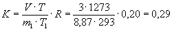 где V - скорость подачи диоксида углерода, см3/с; Т - температура испытания по показаниям контрольной термопары, К; m - масса углерода в навеске кокса, г, вычисляемая по формуле