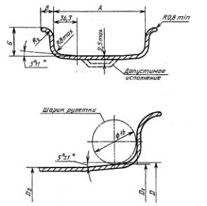 Примечание. Допускаемое биение ободьев в сборе с диском устанавливается в технической документации, утвержденной в установленном порядке. (Измененная редакция, Изм. № 1, 2-4). 2.6. Окраска колес - по ГОСТ 7593. 2.7. Ресурс колес - не менее ресурса транспортного средства. 2.6, 2.7. (Введены дополнительно, Изм. № 1). 3а. МЕТОДЫ КОНТРОЛЯ3а.1. (Исключен, Изм. № 3). 3а.2. Контроль профиля обода следует проводить шаблонами, размеры которых приведены на черт. 15 и в табл. 8.