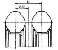 (Измененная редакция, Изм. № 1 - 5). 1.2. Размер обода по ширине посадочной полки по стороны съемного бортового кольца должен соответствовать указанному на черт. 2. * Уменьшение размера по согласованию Черт. 2 (Измененная редакция, Изм. № 1). 1.3. Условное обозначение ободьев - по отраслевой нормативно-технической документации (НТД). (Измененная редакция, Изм. № 4). 1.4. Расположение и размеры вентильного отверстия в основании обода колеса должны соответствовать указанным на черт. 3. 1 - бортовая часть основания обода; 2 - торец замочной части основания обода Черт. 3 (Измененная редакция, Изм. № 1, 3). 1.5. При креплении дисковых и бездисковых колес к ступице расстояние между осями сдвоенных колес b2 должно соответствовать указанному на черт. 4 и в табл. 3. При креплении одинарного дискового колеса вылет диска должен быть равен b2/2. Для колес, применяемых только как одинарные, допускается уменьшение вылета диска. Черт. 4 Таблица 3