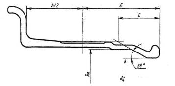 А/2 - размер от центра основания обода до бортовой закраины; Е - размер от центра основания обода до торца замочной части; С - размер для построения посадочного конуса Черт. 10* * Черт. 5-7. (Исключены, Изм. № 4). Черт. 8, 9. (Исключены, Изм. № 2). Таблица 5 Размеры в миллиметрах