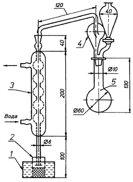 3 Приложения 1 и 2 настоящего стандарта разработаны на основе аутентичного текста международных стандартов ИСО 601-81 «Топливо твердое минеральное. Определение содержания мышьяка фотометрическим методом с применением диэтилдитиокарбамата серебра» и ИСО 2590-73 «Общие методы определения мышьяка. Фотометрический метод применения диэтилдитиокарбамата серебра» 4 Постановлением Комитета Российской Федерации по стандартизации, метрологии и сертификации от 14 марта 1996 г. № 171 межгосударственный стандарт ГОСТ 10478-93 (ИСО 601-81, ИСО 2590-73) введен в действие непосредственно в качестве государственного стандарта Российской Федерации с 1 января 1997 г. 5 ВЗАМЕН ГОСТ 10478-75 6 ПЕРЕИЗДАНИЕ. Июнь 2002 г. ГОСТ 10478-93 (ИСО 601-81, ИСО 2590-73) МЕЖГОСУДАРСТВЕННЫЙ СТАНДАРТ ТОПЛИВО ТВЕРДОЕ Методы определения мышьяка Solid fuel. Methods for determination of arsenic Дата введения 1997-01-01 Настоящий стандарт распространяется на бурые и каменные угли, антрацит, кокс, горючие сланцы и торф и устанавливает два метода фотометрического определения мышьяка в указанных видах топлива: по интенсивности окраски мышьяковомолибденовой сини в диапазонах массовой доли мышьяка от 0,0005 % до 0,01 %; с использованием диэтилдитиокарбамата серебра (приложения 1 и 2). Требования данного стандарта являются обязательными. При возникновении разногласий арбитражным является метод фотометрического определения мышьяка по интенсивности окраски мышьяковомолибденовой сини. 1 Сущность методаСущность метода заключается в озолении навески топлива со смесью Эшка, отделении мышьяка от мешающих примесей отгонкой в виде трихлорида, поглощении его азотной кислотой и фотометрическом определении мышьяка по интенсивности окраски раствора мышьяковомолибденовой сини. 2 Метод отбора проб2.1 Отбор и подготовка проб углей - по ГОСТ 10742. 2.2 Отбор и подготовка проб торфа - по ГОСТ 11303. 2.3 Отбор и подготовка проб кокса - по ГОСТ 23083. 3 Аппаратура и реактивыПечь муфельная электрическая с автоматическим терморегулятором, обеспечивающим температуру нагрева (800 ± 25) °С. Фотоэлектроколориметр или спектрофотометр с основной погрешностью измерений не более 1 % (абс.) с набором кювет. Шкаф сушильный, обеспечивающий температуру нагрева (200 ± 10) °С. Электронагреватель с закрытой спиралью и терморегулятором. Горелка газовая. Весы с погрешностью взвешивания не более 0,0002 г по ГОСТ 24104. Прибор для отгонки мышьяка в виде AsCl3 (рисунок 1). * С 1 июля 2002 г. введен в действие ГОСТ 24104-2001. 1 - сосуд с холодной водой; 2 - приемник дистиллята; 3 - холодильник; 4 - насадка; 5 - перегонная круглодонная колба Рисунок 1 - Прибор для отгонки мышьяка Бани водяная и песчаная. Тигли фарфоровые № 4 высокие по ГОСТ 9147 с хорошо подогнанными крышками. Тигли и крышки нумеруют, прокаливают до постоянной массы и хранят в эксикаторе с осушающим веществом. Пробирки П1-14-150 ХС по ГОСТ 25336, градуированные. Пробирки нумеруют и на них надевают резиновые кольца для установки их в алюминиевый диск. Промывалка вместимостью 500 - 1000 см3. Стаканы В1-50 ТС по ГОСТ 25336. Цилиндры 1-10-2, 1-250-2 по ГОСТ 1770. Бюретки 6-2-2, 6-2-5 по ГОСТ 29252. Колбы 2-250-2, 2-500-2 и 2-1000-2 по ГОСТ 1770. Воронка Бюхнера по ГОСТ 9147. Спирт этиловый (гидролизный) ректификованный по ГОСТ 18300. Аммония молибдат по ГОСТ 3765, раствор 0,01 г/см3, приготовленный из перекристаллизованной соли. Перекристаллизацию проводят следующим образом: 200 г молибдата аммония при нагревании 