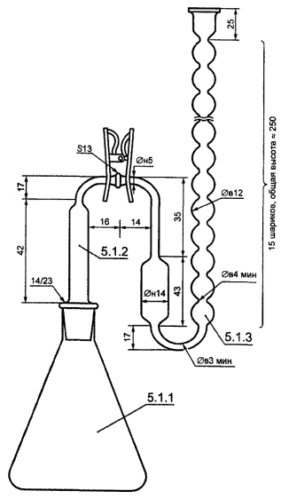 6.5 Если при измерении содержания мышьяка в пробе расхождения между результатами двух измерений превышают допустимое значение d2, проводят третье измерение. Если при этом расхождение между максимальным и минимальным значением в трех измерениях превышает 1,2d2, проводят четвертое измерение. Если при четырех измерениях расхождение между максимальным и минимальным значением превышает 1,3d2, измерения прекращают до выявления и устранения причин, вызвавших рассеяние результатов. 6.6 За результат анализа принимают среднеарифметическое значение из всех измерений, удовлетворяющих 6.2 и 6.3 настоящего стандарта. ПРИЛОЖЕНИЕ 1(обязательное) Топливо твердое минеральное. Определение мышьяка с использованием стандартного фотометрического метода по ИСО 2590, основанного на применении диэтилдитиокарбамата серебра(ИСО 601-81) 1 Назначение и область применения Настоящий международный стандарт устанавливает метод фотометрического определения содержания мышьяка в каменных и бурых углях, лигнитах и коксе с использованием диэтилдитиокарбамата серебра Ag (ДЦТК) по ИСО 2590. Метод применим для определения мышьяка (As), содержащегося во всем растворе пробы либо в аликвоте, взятой для определения и содержащей от 1 до 20 мкг, но не менее чем 1 мкг. 2 Ссылки ГОСТ 1770-74 Посуда мерная лабораторная стеклянная. Цилиндры, мензурки, колбы, пробирки. Общие технические условия ГОСТ 8682-93 (ИСО 383-76) Посуда лабораторная стеклянная. Шлифы конические взаимозаменяемые ГОСТ 9737-93 (ИСО 641-75) Посуда лабораторная стеклянная. Шлифы сферические взаимозаменяемые ИСО 2590-73 Общие методы определения мышьяка. Фотометрический метод с применением диэтилдитиокарбамата серебра 3 Сущность метода Пробу окисляют азотной и серной кислотами или применяют смесь Эшка. Далее, используя метод, установленный в ИСО 2590, мышьяк восстанавливают цинком в среде серной или хлороводородной кислоты с образованием арсина. Арсин поглощают раствором диэтилдитиокарбамата серебра в пиридине и фотометрируют пурпурно-красную окраску коллоидного серебра в максимуме полосы поглощения (длина волны около 540 нм). Примечание - Коллоидное серебро образуется по реакции AsH3 + 6Ag(ДЦТК) = 6Ag + 3Н(ДДТК) + As(ДДТК)3. 4 Реактивы При проведении анализа используют квалификации «ч.д.а.», дистиллированную воду или воду эквивалентного качества. Все реактивы и, в частности, цинк должны быть свободными от мышьяка или иметь очень низкое его содержание. В дополнение к реактивам, указанным в разделе ИСО 2590, необходимы следующие реактивы: 4.1 Кислота серная концентрированная, р = 1,84 г/см3 (для 7.2). 4.2 Кислота азотная концентрированная, р = 1,42 г/см3 (для 7.2). 4.3 Кислота хлороводородная, р = 1,18 г/см3 (для 7.1). 4.4 Смесь Эшка (для 7.1). Две массовые части слабопрокаленного оксида магния смешивают с одной частью безводного карбоната натрия (или калия). Смесь должна полностью проходить через сетку с размером квадратных ячеек 212 мкм (или сетку 02К по ГОСТ 6613). 5 Аппаратура Вся стеклянная аппаратура должна быть выполнена из химически стойкого стекла. Весы с точностью взвешивания до 0,0002 г. В дополнение к аппаратуре, перечисленной в разделе 5 ИСО 2590, необходимо следующее оборудование: 5.1 Аппарат для мокрого окисления пробы (рисунок 2) (для 7.2), состоящий из следующих частей: 5.1.1 Колба Къельдаля номинальной вместимостью 300 см3 с взаимозаменяемым конусом 24/29. 5.1.2 Трубка для отвода пар