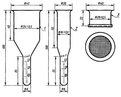 Дата введения 01.01.74 Настоящий стандарт распространяется на торф, отобранный из залежи, и устанавливает метод определения степени разложения. Под степенью разложения торфа понимается процентное содержание в нем бесструктурной массы, включающей наряду с гуминовыми веществами и мелкие частицы негумифицированных остатков. Стандарт не распространяется на переработанный торф. Сущность метода заключается в отделении коагулированного гумуса от волокна ситовым анализом в водной среде с формированием объемов осадков центрифугированием и последующим определением степени разложения с помощью графика. 1. АППАРАТУРА, МАТЕРИАЛЫ И РЕАКТИВЫЦентрифуга электрическая марок ЦЛК-1, ОПН-3 или другой марки, обеспечивающая частоту вращения 1000 мин-1. Пробиркодержатель для центрифуги (черт. 1 и 2). Реле времени марки РВУ 1У4. Пробирки центрифужные большие и малые (черт. 3). Стакан с ситом (см. черт. 3), сетка № 025 К по ГОСТ 6613. Пробоотборник с поршнем (черт. 4). Чашечки фарфоровые № 7, 8 по ГОСТ 9147. Железо треххлористое 6-водное по ГОСТ 4147, 10 %-ный водный раствор. Кислота соляная по ГОСТ 3118, раствор 1 моль/дм3. Натр едкий технический по ГОСТ 2263 или натрия гидроокись по ГОСТ 4328, раствор 1 моль/дм3. Калия гидрат окиси технический по ГОСТ 9285, раствор 1 моль/дм3. Штатив, капельница, кристаллизатор, груша резиновая, ложка чайная. (Измененная редакция, Изм. № 1, 2). 1 - кольцо для больших пробирок; 2 - кольцо для малых пробирок 1 - большая пробирка; 2 - малая пробирка; 3 - стакан с ситом 1 - пробоотборник; 2 - поршень 2. ПОДГОТОВКА К ИСПЫТАНИЮ2.1. Подготовка пробы торфа с массовой долей общей влаги 65 % и более Пробу торфа массой 100 - 200 г, отобранную от испытуемого образца по ГОСТ 17644, расплющивают ровным слоем толщиной 3 - 4 мм и просекают пробоотборником на глубину всего слоя в 10 - 12 точках, равномерно расположенных по площади. 2.2. Подготовка пробы торфа с массовой долей общей влаги менее 65 % Проба торфа с массовой долей общей влаги менее 65 % требует предварительной обработки. Часть пробы помещают в фарфоровую чашку (количество торфа берут из расчета, что после набухания торф заполнит чашку на 2/3 - 3/4 ее объема) и заливают раствором щелочи (натра едкого технического, гидроокиси натрия или гидрата окиси калия технического). Через 24 - 30 ч пробу торфа тщательно перемешивают и, если проба остается комковатой, добавляют еще немного щелочи и продолжают перемешивать до получения однородной массы. Пробу торфа отбирают из чашки пробоотборником или ложкой и далее проводят испытание. (Измененная редакция, Изм. № 2). 3. ПРОВЕДЕНИЕ ИСПЫТАНИЯ3.1. Проведение испытания торфа с массовой долей общей влаги 65 % и более. 3.1.1. Отобранную в соответствии с п. 2.1 пробу торфа помещают в малую пробирку, заливают водой (на 1 см ниже края пробирки), перемешивают палочкой, добавляют для коагуляции гумуса 2 - 3 капли 6-водного треххлористого железа и взбалтывают до получения однородной суспензии. 3.1.2. После получения однородной суспензии пробирку с содержимым вставляют в центрифугу и в течение 2 мин вращают с частотой 1000 мин-1. После полной остановки центрифуги пробирку вынимают и замеряют объем образовавшегося осадка по шкале пробирки. Если поверхность осадка негоризонтальная, отсчет ведут по средней линии между верхней и нижней точками поверхности. Граница осадка должна быть четкой, жидкость над ним не должна иметь взвеси. Объем осадка 