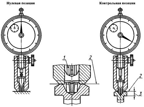 2. МЕТОДЫ КОНТРОЛЯ 2.1. Размеры шлицев контролируют комплексным калибром путем измерения глубины вхождения калибра в шлиц. Глубину вхождения калибра в шлиц указывают в стандартах на крепежные изделия конкретного типа. Глубину вхождения калибра в шлиц измеряют при помощи глубиномера (черт. 3). Конец калибра идентичен концу соответствующей отвертки. Втулка служит для направления калибра и для фиксации соответствующей контрольной плоскости. Контрольная плоскость проходит через точки пересечения выступов шлица с верхней поверхностью головки. Опорную плоскость фиксируют при помощи опорных выступов втулки.