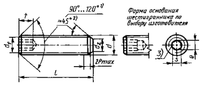 1) Угол фаски 120° обязателен для коротких винтов, длина которых приведена над штриховой ступенчатой линией в таблице 1. 2) Угол 45° относится только к части конца ниже внутреннего диаметра резьбы. 3) Допускается небольшое скругление или зенковка. Таблица 1