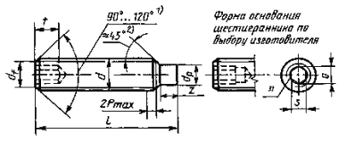 1) Угол фаски 120° обязателен для коротких винтов, длина которых приведена над штриховой ступенчатой линией в таблице 1. 2) Угол 45° относится только к части конца ниже внутреннего диаметра резьбы. 3) Допускается небольшое скругление или зенковка. Таблица 1