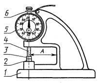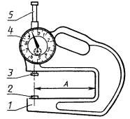 Дата введения 01.01.90 Настоящий стандарт распространяется на индикаторные толщиномеры и стенкомеры с верхним пределом измерения до 50 мм, оснащенные отсчетным устройством с ценой деления 0,01 и 0,1 мм (далее - толщиномеры и стенкомеры), и устанавливает обязательные требования к ним в части пп. 1.1, 1.2, 2.2, 2.4, 2.6 и 2.9. (Измененная редакция, Изм. № 1). 1. ОСНОВНЫЕ ПАРАМЕТРЫ И РАЗМЕРЫ1.1. Толщиномеры и стенкомеры должны изготовлять следующих типов: ТН-10, ТН-25 (черт. 1) - настольные толщиномеры с нормированным измерительным усилием; ТР-10, ТР-25 (черт. 2) - ручные толщиномеры с нормированным измерительным усилием; ТР-25Б, ТР-50Б (черт. 3) - ручные толщиномеры без нормированного измерительного усилия; С-2, С-10А (черт. 4) - стенкомеры с ценой деления 0,01 мм отсчетного устройства; С-10Б (черт. 5); С-25, С-50 (черт. 6) - стенкомеры с ценой деления 0,1 мм отсчетного устройства. 1 - корпус; 2 - пятка; 3 - измерительный наконечник; 4 - измерительный стержень; 5 - отсчетное устройство; 6 - арретир; А - вылет Черт. 1 1 - корпус; 2 - пятка; 3 - измерительный наконечник; 4 - измерительный стержень; 5 - отсчетное устройство; 6 - арретир; А - вылет Черт. 2 1 - корпус; 2 - пятка; 3 - измерительный наконечник; 4 - отсчетное устройство; 5 - измерительный стержень; А - вылет Черт. 3 1 - корпус; 2 - неподвижный стержень; 3 - измерительный наконечник; 4 - отсчетное устройство; 5 - арретир Черт. 4 1 - ручка; 2 - неподвижный стержень; 3 - измерительный наконечник; 4 - отсчетное устройство; 5 - арретир Черт. 5 1 - корпус; 2 - неподвижный стержень; 3 - измерительный наконечник; 4 - отсчетное устройство; 5 - арретир Черт. 6 Примечание. Черт. 1-6 не определяют конструкцию. 1.2. Типы, основные параметры и размеры толщиномеров и стенкомеров должны соответствовать указанным на черт. 1-6 и в табл. 1, 2. 1.3. Примеры условных обозначений: - настольного толщиномера с диапазоном измерения 0 - 10 мм, с вылетом А = 60 мм, с нормированным измерительным усилием и не оснащенного твердым сплавом: Толщиномер ТР 10-60 ГОСТ 11358-89 - ручного толщиномера с диапазоном измерения 0 - 25 мм, с вылетом А = 60 мм, с нормированным измерительным усилием и оснащенного твердым сплавом: Толщиномер ТР 25-60Т ГОСТ 11358-89 - то же, без нормированного измерительного усилия и оснащенного твердым сплавом: Толщиномер ТР 25-60БТ ГОСТ 11358-89 - стенкомера типа С-2 с диапазоном измерения 0 - 2 мм: Стенкомер С-2 ГОСТ 11358-89 Таблица 1 В миллиметрах