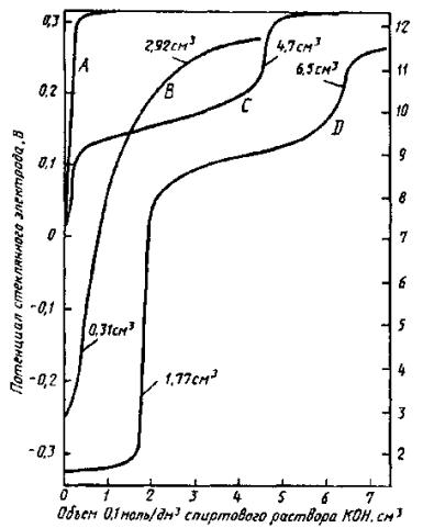 Примечание - Для загущенных масел масса пробы для титрования (0,7 ± 0,2) г. Кислотность определяют в светлых нефтепродуктах, при определении кислотности на анализ берут 100 см3 нефтепродукта. 10.2. Определение кислотного числа Заполняют бюретку 0,1 моль/дм3 спиртовым раствором гидроокиси калия (при кислотном числе до 1 мг/г - 0,05 моль/дм3 спиртовым раствором гидроокиси калия) (5.11) и помещают в штатив так, чтобы конец бюретки был погружен на 25 мм в жидкость в стакане. Записывают начальный объем раствора в бюретке и показание измерительного прибора (потенциал электродов). 10.3. Метод титрования вручную Примечание - За показания измерительного прибора принимают потенциал, не изменяющийся в течение 1 мин более чем на 5 мВ. Это означает, что необходимо 1 - 2 мин для изменения потенциала на 100 мВ при добавлении 0,05 см раствора. Добавление 0,1 см3 требует 3 - 5 мин. 10.3.2. В начале титрования, а также в точках перегиба кривой титрования, когда добавление 0,1 см3 0,1 моль/дм3 раствора гидроокиси калия вызывает изменение потенциала более чем на 30 мВ, добавляют порции раствора по 0,05 см3. 10.3.3. На промежуточных участках, когда добавление 0,1 см3 0,1 моль/дм3 спиртового раствора гидроокиси калия вызывает изменение потенциала менее чем на 30 мВ, объем титранта увеличивают так, чтобы однократно введенная порция раствора вызывала изменение потенциала не более чем на 30 мВ. 10.3.4. Титрование заканчивают, когда потенциал после добавления 0,1 см3 раствора гидроокиси калия изменится менее чем на 5 мВ, а определяемый потенциал системы указывает на то, что титруемый раствор является более щелочным, чем неводный щелочной буферный раствор. 10.3.5. Удаляют титруемый раствор, промывают электроды и конец бюретки растворителем для титрования, затем пропан-2-олом или этанолом в зависимости от применяемого растворителя и заканчивают промывку дистиллированной водой. Погружают электроды в дистиллированную воду не менее чем на 5 мин перед следующим титрованием для восстановления водного гелевого слоя стеклянного электрода. Хранят электроды в дистиллированной воде. Если обнаруживается, что электроды загрязнены, их очистку проводят согласно рисунку 2. 10.4. Метод автоматического титрования 10.4.1. Регулируют аппарат в соответствии с инструкциями изготовителя, чтобы установить потенциал при титровании вручную, как указано в примечании к 10.3.1, и (или) обеспечить непрерывную скорость подачи титранта менее чем 0,2 см3/мин во время титрования и 0,05 см3/мин в точках перегиба и в конечной точке, соответствующей точке при титровании свежеприготовленного стандартного неводного щелочного буферного раствора. 10.4.2. Проводят титрование с автоматической регистрацией кривой титрования. Титруют 0,1 моль/дм3 спиртовым раствором гидроокиси калия до получения постоянного потенциала (например, изменение потенциала менее 5 мВ при добавлении 0,1 см3 раствора гидроокиси калия (автоматическая конечная точка) или до тех пор, пока изменение потенциала щелочного буферного раствора не покажет, что раствор более щелочной, чем свежеприготовленный неводный щелочной буферный раствор (конечная точка выбрана предварительно). А - контрольное определение на 125 см3 растворителя для титрования; В - 10,00 г отработанного картерного масла и 125 см3 растворителя для титрования. Так как четких точек перегиба не видно, конечные точки выбирают по пока