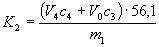 где Vo - объем 0,1 моль/дм3 раствора гидроокиси калия, израсходованный на титрование контрольного опыта до значения ЭДС в щелочном буферном растворе или до скачка потенциала в этой области, см; V1 - объем 0,1 или 0,05 моль/дм3 раствора гидроокиси калия, израсходованный на титрование образца до значения ЭДС в щелочном буферном растворе или до скачка потенциала в этой области, см; m1 - масса анализируемого продукта, г; с3 - концентрация раствора гидроокиси калия, определенная по 5.11.2, моль/дм, 56,1 - эквивалентная масса гидроокиси калия, г. 11.3.2. Кислотное число сильных кислот K2 в миллиграммах гидроокиси калия на 1 г продукта вычисляют по формуле