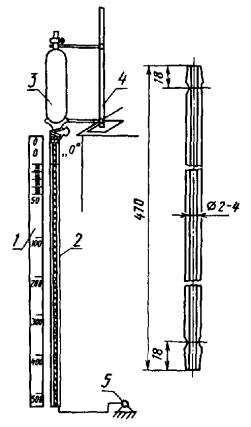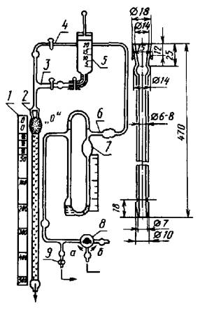 Дата введения 01.01.77 Настоящий стандарт распространяется на газы, получаемые в процессе переработки нефти, и устанавливает метод определения объемной доли сероводорода от 0,001 до 15,0 %. Применение метода в диапазоне 0,001 - 0,010 % предусмотрено для контроля товарной продукции, в диапазоне 0,01 - 15,00 % - для внутризаводского контроля. Сущность метода заключается в химическом взаимодействии сероводорода с уксуснокислым свинцом, нанесенным на силикагель. Образующийся в результате реакции сернистый свинец дает черное окрашивание слоя силикагеля, высота которого зависит от объемной доли сероводорода в анализируемом газе. (Измененная редакция, Изм. № 3). 1. АППАРАТУРА, РЕАКТИВЫ И МАТЕРИАЛЫ1.1. При определении объемной доли сероводорода в газах применяют: аппарат для определения сероводорода при объемной доле его в газе менее 0,1 % (черт. 1), состоящий из металлической линейки по ГОСТ 427 или линейных измерителей аналогичного типа с той же ценой деления длиной 500 мм, газовой пипетки по ГОСТ 18954 вместимостью 500 см2, лабораторного штатива, реакционной капиллярной трубки с внутренним диаметром 2 - 4 мм и вакуумного насоса любого типа, обеспечивающего вакуумирование до остаточного давления 0,5 кПа; аппарат для определения сероводорода при объемной доле его в газе от 0,1 % и более (черт. 2), состоящий из металлической линейки по ГОСТ 427 или линейных измерителей аналогичного типа с той же ценой деления, реакционной трубки с внутренним диаметром 6 - 8 мм, верхнего и нижнего двухходовых кранов по ГОСТ 7995, медицинского шприца типа «Рекорд», вместимостью 20 см3, осушителя, реометра с диапазоном измерений от 0 до 100 см3/мин по ГОСТ 9932, трехходового крана по ГОСТ 7995 и винтового зажима, которые крепятся на панели размером 75´30´3 мм. Допускается проведение анализов на приборе (черт. 1) с использованием при этом реакционной капиллярной трубки с внутренним диаметром 6 - 8 мм и газовой пипетки вместимостью 50 см3. Схема аппарата для определения сероводорода при объемной доле его в газе менее 0,1 %1 - металлическая линейка; 2 - реакционная капиллярная трубка; 3 - газовая пипетка; 4 - лабораторный штатив; 5 -вакуумный насос Черт. 1 шкаф сушильный, обеспечивающий температуру до 150 °С с погрешностью не более 2 °С; компрессор или общая магистраль для нагнетания воздуха; весы технические с диапазоном определения массы от 0 до 500 г с погрешностью не более 0,1 г; Схема аппарата для определения сероводорода при объемной доле его в газе более 0,1 % 1 - металлическая линейка; 2 - реакционная капиллярная трубка; 3 - нижний двухходовой кран; 4 - верхний двухходовой кран; 5 - медицинский шприц; 6 - осушитель; 7 - реометр; 8 - трехходовой кран; 9 - винтовой зажим Черт. 2 пробоотборник по ГОСТ 14921 любого типа; набор сит «физприбор» с отверстиями сит размером 0,25; 0,50 мм или набор сит с отверстиями размером 0,20; 0,50 мм; сетку проволочную по ГОСТ 6613 или стеклянную вату; аппарат Киппа; газометр по ГОСТ 25336; посуду фарфоровую по ГОСТ 9147, ступка № 5 или № 6, чашка № 5 или № 6; воронку делительную по ГОСТ 25336, вместимостью 1000 см3; пипетки газовые по ГОСТ 18954, вместимостью 500 и 1000 см3; эксикатор по ГОСТ 25336; банки стеклянные с притертой пробкой, вместимостью 500 см3; силикагель по ГОСТ 3956, марки КСКГ или марки АСКГ для определения сероводорода при объемной доле его в газе менее 0,1 %; силикагель № 3 или № 2,5 для определения сероводорода при объемной доле его в 