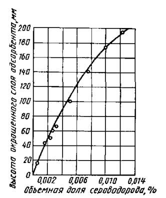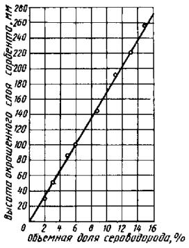 где V1 - объем исходной смеси, израсходованной для приготовления градуировочных смесей, см3; Х1 - объемная доля сероводорода в исходной смеси, определенная по п. 2.4.4.2, %; V2 - объем калиброванной пипетки, см3. 2.4.4.4. Градуировочные смеси, приготовленные по п. 2.4.4.1, поочередно анализируют по п. 3.1. По полученным данным строят график, на котором по оси ординат откладывают высоту окрашенного слоя сорбента (мм), а по оси абсцисс соответствующее содержание объемной доли сероводорода в анализируемой смеси в процентах. В связи с тем, что применяемые для градуировки газовые пипетки имеют неодинаковые объемы, то при построении градуировочного графика получаемые высоты окрашенного слоя сорбента (п. 3.1) следует пересчитывать на постоянный объем (V = 500 см3). Пример построения градуировочного графика приведен на черт. 3. Этот график построен для смесей с содержанием объемной доли сероводорода 0,001 - 0,01 %, для этого использовалась исходная смесь с содержанием объемной доли сероводорода 0,1 % и реакционная трубка диаметром 2 мм. Градуировочный график для определения сероводорода при объемной доле его в газе менее 0,1 % Черт. 3 При построении графика для смесей с содержанием объемной доли сероводорода 0,01 - 0,1 % применяют реакционную трубку диаметром 4 мм и готовят исходную смесь с содержанием объемной доли сероводорода 0,5 %. При построении графика для смесей с объемной долей сероводорода 0,1 - 15,0 % применяют реакционную трубку диаметром 6 мм и готовят исходную смесь с объемной долей сероводорода 2,5 %. (Измененная редакция, Изм. № 1). 2.4.5. Приготовление смесей сероводорода с воздухом при объемной доле его в смеси более 0,1 % 2.4.5.1. В газовые пипетки вместимостью 500 см3, подготовленные по п. 2.4.2, вводят с помощью шприца сероводород, полученный по п. 2.4.1 последовательно по 10, 15, 25, 30, 42, 55, 65, 75 см3. Затем каждую пипетку заполняют воздухом аналогично п. 2.4.3. Градуировочный график для определения сероводорода при объемной доле его в газе более 0,1 % Черт. 4 2.4.5.2. От градуировочных смесей, полученных по п. 2.4.5.1, отбирают шприцем по 20 см3 смеси и поочередно анализируют по п. 3.2. Анализ каждой смеси проводят не менее трех раз. 2.4.5.3. Объемную долю сероводорода в каждой градуировочной смеси определяют по п. 2.4.4.2. Объем градуировочной смеси в пипетке рассчитывают по разности известного объема (V) пипетки и суммарного объема смеси, взятой на анализ по п. 3.2. 2.4.5.4. По полученным данным строят график в соответствии с п. 2.4.4.4. Пример построения градуировочного графика приведен на черт. 4. 2.4.6. Для построения градуировочных графиков рекомендуется использовать аттестованные газовые смеси сероводорода с воздухом с объемной долей сероводорода 0,01; 0,1; 1,0 и 10,0 %. (Введен дополнительно, Изм. № 4). 3. ПРОВЕДЕНИЕ АНАЛИЗА3.1. Определение сероводорода при объемной доле в газе менее 0,1 %. Газовую пипетку с анализируемой пробой газа, отобранной по п. 2.2.2, устанавливают в приборе по п. 2.3.1. Включают вакуумный насос, постепенно открывая нижний кран газовой пипетки, просасывают газ через реакционную трубку в течение 3 мин. Затем открывают верхний кран газовой пипетки и пропускают через нее в реакционную трубку воздух в течение 2 мин. После этого вакуумный насос соединяют с атмосферой и отключают его. Высоту окрашенного слоя силикагеля измеряют линейкой с погрешностью не более 1 мм и пересчитывают на объем газовой пипетки 500 см3, по гр