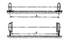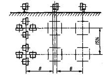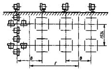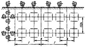 Примечания: 1 Применение конкретного типа катков с ребордой или гладких катков, а также указанных в табл. 21, 22 и на черт. 1-4 расстояний между катками должно устанавливаться в стандартах или технических условиях на трансформаторы конкретных групп и типов. 2 Связь между массой трансформаторов и колеей рекомендуемая. 3 Связь между размерами на черт. 2-4 и посадочными местами кареток на трансформаторе должна соответствовать размерам рельсов по ГОСТ 7174. 4 По согласованию между изготовителем и потребителем допускается применение ширины колеи для поперечной перекатки трансформаторов, а также количество катков, отличные от указанных на черт. 2-4. Трансформаторы массой 200-255 т Черт. 2