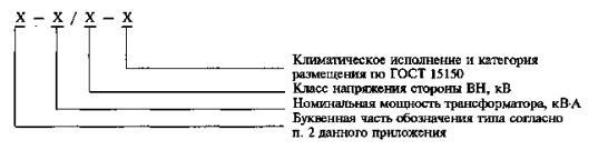 9.4.2 Допустимые продолжительные превышения напряжения 9.4.2.1 Трансформаторы классов напряжения до 35 кВ включительно мощностью свыше 630 кВ·А и все трансформаторы классов напряжения от 110 до 1150 кВ включительно допускают продолжительную работу (при мощности не более номинальной) при превышении напряжения на любом ответвлении любой обмотки на 10% более номинального напряжения данного ответвления. При этом напряжение на любой обмотке не должно превышать наибольшее рабочее напряжение по ГОСТ 721. 9.4.2.2 Допустимые продолжительные превышения напряжения для трансформаторов классов напряжения до 35 кВ включительно мощностью до 630 кВ·А включительно устанавливают в стандартах или технических условиях на эти трансформаторы. 9.4.2.3 Для автотрансформаторов РПН в нейтрали допускается продолжительное превышение напряжения (при мощности не более номинальной), подводимого к любому ответвлению любой обмотки более 10% сверх номинального напряжения данного ответвления при условии обеспечения контроля за возбуждением автотрансформатора в процессе его работы, которое не должно превышать 110% нормального рабочего возбуждения. Примечания: 1 За нормальное рабочее возбуждение принимают наибольшее из значений возбуждения автотрансформатора, имеющих место при подведении на холостом ходу к каждому из ответвлений номинального напряжения этого ответвления. 2 В случае вынесенного устройства РПН (например, последовательного регулировочного трансформатора) автотрансформатор вместе с этим устройством рассматривают как единое целое. 9.4.2.4 При превышении напряжения в соответствии с п. п. 9.4.2.1, 9.4.2.2, 9.4.2.3 напряжение на любой стороне не должно превышать наибольшее рабочее напряжение, установленное ГОСТ 721. 9.5 В двухобмоточных трансформаторах с расщепленной обмоткой НН при одинаковых номинальных напряжениях ее частей допускается работа при параллельном соединении этих частей. 9.6 По согласованию между изготовителем и потребителем допускается установка трансформатора непосредственно на фундамент (без кареток или катков). 9.7 На месте установки трансформатору должен быть придан уклон, если об этом имеется указание в эксплуатационной документации изготовителя. 9.8 Трансформаторы и автотрансформаторы допускают параллельную работу при условии, что ни одна из обмоток не будет нагружена током, превышающим допустимый ток для данной обмотки. 9.9 Подъем трансформатора полной массой более 200 т в полностью собранном виде при монтаже или в эксплуатации должен быть согласован между изготовителем и потребителем. 10. ГАРАНТИИ ИЗГОТОВИТЕЛЯ10.1 Изготовитель гарантирует соответствие трансформаторов требованиям настоящего стандарта при соблюдении условий транспортирования, хранения, монтажа и эксплуатации. Гарантийный срок эксплуатации трансформаторов, которым присвоен государственный Знак качества, - 5 лет; остальных трансформаторов - 3 года со дня ввода их в эксплуатацию. ПРИЛОЖЕНИЕ 1Обязательное Условное обозначение трансформаторов1 Структурная схема условного обозначения трансформатора.