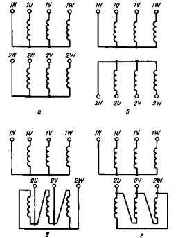 а) Ун/Ун-0; б) Ун/Ун-6; в) Ун/Д-5; г) Ун/Д-11 Черт. 8 Маркировка трехфазного трехобмоточного трансформатора (Ун/Ун/Д-0-5)