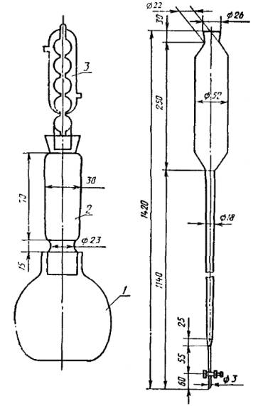 Постановлением Государственного комитета СССР по стандартам от 21 мая 1985 г. № 1427 срок действия установлен с 01.01.86 до 01.01.91 Несоблюдение стандарта преследуется по закону Настоящий стандарт устанавливает два метода (А и Б) определения массовой доли парафина в нефти. Метод А заключается в предварительном удалении асфальтово-смолистых веществ из нефти, их экстракции и адсорбции и последующем выделении парафина смесью ацетона и толуола при температуре минус 20 °С. Метод Б заключается в предварительном удалении асфальтово-смолистых веществ из нефти вакуумной перегонкой с отбором фракций 250 - 550 °С и выделении парафина парным растворителем - смесью спирта и эфира при температуре минус 20 °С. 1. МЕТОД А1.1. Аппаратура, реактивы и материалы Посуда и оборудование лабораторные стеклянные по ГОСТ 25336-82: экстракционный аппарат, состоящий из колб круглодонных узкогорлых К-1-100-29/32ТС, насадки НЭТВ-25 ХС и холодильника X111-1-200-29/32 ХС, или экстракционный аппарат (черт. 1), воронка коническая В-75-140, колбы Кн-1-50-14/23 ТС, Кн-1-100-29/32 ТС, Кн-1-500-29/32 ТС, К-1-250-29/32 ТС, КП-1-1000-29/32ТС, фильтрующие воронки ВФ-1-32 ПОР ТХС или ВФ-1-40 ПОР 40 ТХС, пробирка П1-16-150 ХС, холодильник стеклянный ХПТ-1-600-14/23ХС, аллонж АИ-14/23-60 ТС, эксикатор 1-140, или 1-190, или 1-250, насос водоструйный или аналогичного типа, обеспечивающий остаточное давление не более 13,3 гПа (10 мм рт. ст.). Лопаточка стеклянная длиной 220 мм, диаметром 5 - 7 мм. Цилиндры 1 - 25, 50 по ГОСТ 1770-74. Чашка фарфоровая диаметром 200 мм по ГОСТ 9147-80. Адсорбционная колонка стеклянная (черт. 2). Аппарат для фильтрования (черт. 3). Термометр типа ТЛ-21-Б1 по ГОСТ 215-73. Термометры стеклянные типа ТН5 по ГОСТ 400-80 и типа ТН6. (Измененная редакция, Изм. № 2). Плитка электрическая с закрытой спиралью. Шкаф сушильный. Весы лабораторные общего назначения с пределом взвешивания 200 г и погрешностью не более ±0,0002 г. (Измененная редакция, Изм. № 2). Бумага фильтровальная ФНБ или по ГОСТ 12026-76. Фильтры беззольные марки «синяя лента» с зольностью не более 0,00038 %. Груша резиновая. Баня водяная. Баня масляная с температурой вспышки масла в закрытом тигле не ниже 250 °С и открытом тигле не ниже 275 °С. (Поправка. ИУС 10-2007) Ацетон по ГОСТ 2603-79. Толуол по ГОСТ 14710-78 или ГОСТ 5789-78, марки ч. д. а. н-Гексан, ч. д. а. Спирт этиловый ректификованный по ГОСТ 5962-67 или спирт этиловый, ректификованный технический по ГОСТ 18300-87. н-Гептан эталонный по ГОСТ 25828-83. Фракция НК-50 °С, не содержащая ароматических углеводородов, выделенная из алкилбензина или нефраса П4-30/80 по ГОСТ 26377-84 ректификацией. Нефрас-С2-80/120 или нефрас-С3-80/120 (бензин-растворитель) по ГОСТ 443-76. (Измененная редакция, Изм. № 2). 1 - колба; 2 - насадка; 3 - холодильник Черт. 1 Черт. 2 Вода дистиллированная. (Измененная редакция, Изм. № 2). Охладительные смеси: спирт этиловый и двуокись углерода твердая (сухой лед) или жидкий азот. Силикагель марки АСКГ по ГОСТ 3956-76 или аналогичный, допускается применять регенерированный силикагель. (Измененная редакция, Изм. № 2). Азот-газ в баллоне. П. 1.1. (Новая редакция, Изм. № 1). 1.2. Подготовка к испытанию 1.2.1. Силикагель насыпают в фарфоровую чашку на 3/4 емкости и помещают на 6 ч в воздушный термостат при температуре (180 ± 10) °С. Затем силикагель, не охлаждая, переносят в сухую колбу, предварительно нагретую в течение 15 мин в том же термостате. Колбу с силикагелем плотно закрывают резиновой пробкой во избежание поглощения влаги из воздуха. Для реге