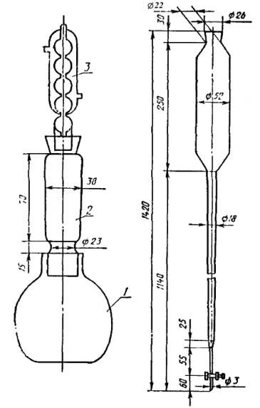 1 - колба; 2 - насадка; 3 - холодильник Черт. 1 Черт. 2 Вода дистиллированная по ГОСТ 6709-72. Охладительные смеси: спирт этиловый и двуокись углерода твердая (сухой лед) или жидкий азот. Силикагель марок АСК с размером зерен 0,2 - 0,5 мм ГОСТ 3956-76, допускается применять регенерированный силикагель. Азот-газ в баллоне». Пункт 1.2 изложить в новой редакции: «1.2. Подготовка к испытанию 1.2.1. Силикагель насыпают в фарфоровую чашку на 3/4 емкости и помещают на 6 ч в воздушный термостат при температуре (180 ± 10) °С. Затем силикагель, не охлаждая, переносят в сухую колбу, предварительно нагретую в течение 15 мин в том же термостате. Колбу с силикагелем плотно закрывают резиновой пробкой во избежание поглощения влаги из воздуха. Для регенерирования силикагель промывают в колонке спиртотолуольной смесью в соотношении 1:1 до получения бесцветного растворителя. Далее силикагель промывают дистиллированной водой и сушат на воздухе в течение 6 ч, а затем выдерживают в воздушном термостате при температуре (180 ± 10) °С в течение 6 ч. 1.2.2. Для проведения анализа берут навеску нефти массой 5 г. При содержании асфальтово-смолистых веществ 10 % и более масса навески 3 г. Навеску, взвешенную с погрешностью не более 0,01 г в колбе экстракционного аппарата вместимостью 500 см3, разбавляют 40-кратным объемом н-гептана или 30-кратным объемом фракции НК-50 °С. 1.2.3. Для осаждения асфальтенов раствор нефти в н-гептане отстаивают в темном месте в течение 16 ч при температуре окружающей среды. Для осаждения асфальтенов нефти из раствора нефти фракцией НК-50 °С собирают экстракционный аппарат (см. черт. 1), ставят на водяную баню с температурой воды 50 - 55 °С, кипятят 30 - 35 мин, поддерживая указанную температуру добавлением горячей воды в баню (применение электроподогрева исключается). По истечении указанного срока раствор оставляют стоять в течение 12 ч в аппарате на водяной бане, с момента прекращения кипения, в защищенном от света месте. 1.2.4. Отстоявшийся раствор н-гептана (или фракции НК-50 °С) с асфальтенами осторожно без перемешивания фильтруют через двойной фильтр «синяя лента». Затем осадок переносят на тот же фильтр при помощи н-гептана (или фракции НК-50 °С) и промывают до тех пор, пока стекающий раствор не будет прозрачным и после его испарения на фильтровальной бумаге не останется масляного пятна. 1.2.5. Для удаления соосажденных смол и парафина фильтр быстро помещают в насадку экстракционного аппарата. В колбу экстракционного аппарата вместимостью 100 см3 наливают 50 см3 н-гептана (или фракции НК-50 °С). Собирают аппарат и помещают на масляную (водяную) баню. При использовании н-гептана экстракцию проводят на масляной бане, нагретой до температуры 110 - 120 °С в течение часа, при использовании фракции НК-50 °С - на водяной бане, нагретой до 50 - 55 °С в течение 30 мин. Перед началом экстракции нагрев проводят таким образом, чтобы фильтр с осадком полностью заполнился растворителем, затем продолжают экстракцию со скоростью 2 - 4 капли в секунду. При использовании н-гептана проводят дополнительную экстракцию спиртом для более полного удаления высокоплавких церезинов. Для этого после окончания экстракции н-гептаном берут другую колбу вместимостью 100 см3, в которую наливают 50 см3 этилового спирта, и проводят экстракцию в течение 5 - 10 мин. 1.2.6. Фильтрат, полученный после фильтрования и промывки асфальтенов, помещают в 
