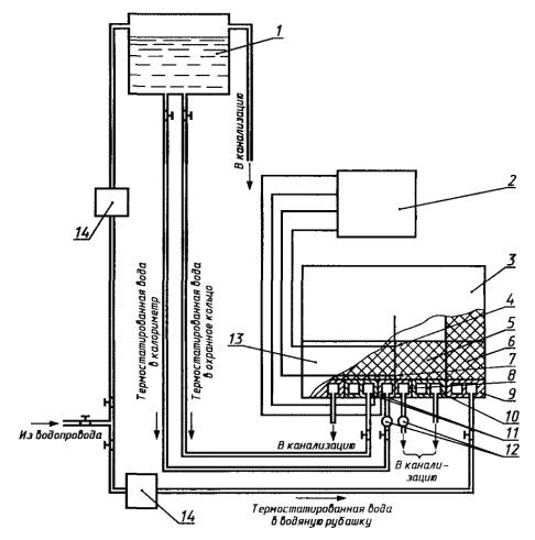Постановлением Государственного комитета СССР по стандартам от 22 апреля 1985 г. № 1128 дата введения установлена Ограничение срока действия снято по протоколу № 5-94 Межгосударственного совета по стандартизации, метрологии и сертификации (ИУС 11-12-94) Настоящий стандарт устанавливает метод измерения теплопроводности огнеупоров с теплопроводностью от 0,13 до 15 Вт/(м×К) при стационарном одномерном температурном поле в плоском образце и при температуре на горячей стороне образца от 400 °С до 1350 °С. Стандарт не распространяется на волокнистые и сыпучие огнеупоры. Стандарт полностью соответствует СТ СЭВ 4552-84. 1. МЕТОД ОТБОРА ОБРАЗЦОВ1.1. Метод отбора образцов, подлежащих измерению, их количество, а также температура измерения устанавливаются по нормативно-технической документации на конкретный материал. Если в ней не установлено количество образцов, теплопроводность определяют на одном образце. 1.2. Образец должен иметь форму прямоугольного параллелепипеда с размерами 114´114´(65 - 32) мм. Огнеупоры с теплопроводностью 0,13 - 0,18 Вт/(м×К) испытывают на образцах толщиной 32 мм. Отклонения по размерам образца допускаются ± 2 мм. Допускается применение образцов больших размеров, если это не приводит к увеличению погрешности определения теплопроводности. 2. АППАРАТУРАУстановка для измерения теплопроводности (см. чертеж): 1 - водонапорный бак; 2 - прибор для измерения термоэдс; 3 - верхняя часть печи; 4 - термоэлектрический преобразователь платинородий-платиновый; 5 - образец; 6 - теплоизоляция боковой поверхности образца; 7 - термопреобразователь хромель-алюмелевый; 8 - калориметр; 9 - водяная рубашка; 10 - охранное кольцо; 11 - термопреобразователи хромель-копелевые; 12 - термометры для измерения повышения температуры воды в калориметре; 13 - нижняя часть печи; 14 - регулирующее устройство для поддержания заданной температуры воды 2.1. Электропечь, обеспечивающую односторонний нагрев испытуемого образца (его горячей поверхности) до заданной температуры в воздушной среде. Печь состоит из двух частей - верхней и нижней. В верхней части расположено не менее трех карбидокремниевых нагревателей. Допускается применение других видов нагревателей, обеспечивающих заданную температуру нагрева образца. В нижней части печи в одной горизонтальной плоскости расположены калориметр с охранным кольцом и водяная рубашка. Площадь поверхности калориметра, контактирующей с образцом, должна составлять 10 % - 30 % площади образца. 2.2. Трансформатор по ГОСТ 9680-77. Допускается применение системы автоматического регулирования нагрева образца и других источников автоматического регулирования нагрева образца. 2.3. Водонапорный бак вместимостью не менее 100 дм3 с постоянным уровнем воды, установленный на высоте не менее 2,5 м от плоскости калориметра. Допускается другая высота установки бака, если обеспечивается указанный в п. 4.2 расход воды. 2.4. Термостат жидкостный лабораторный. Допускается применять регулирующее устройство, обеспечивающее поддержание заданной температуры воды с погрешностью не более 0,5 °С и нестабильностью во время измерения не более 0,1 °С. 2.5. Прибор для измерения термоэдс от 0 до 50 мВ с пределом допускаемой погрешности ± 0,025 мВ. 2.6. Коммутирующее устройство, позволяющее подключить к измерительному прибору не менее четырех термоэлектрических преобразователей (термопреобр