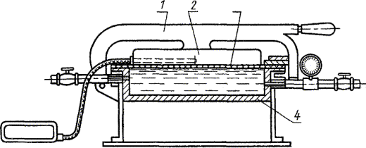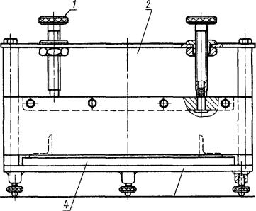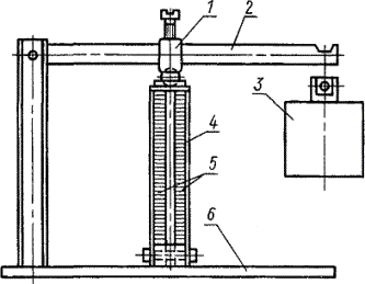 где m - масса клея до сушки, г; m1 - масса клея после сушки, г. За результат испытания принимают среднее арифметическое результатов двух параллельных определений, абсолютное расхождение между которыми не превышает допускаемое расхождение, равное 0,5 %. Допускаемая абсолютная суммарная погрешность результата испытания ± 0,3 % при доверительной вероятности 0,95. (Измененная редакция, Изм. № 2, 3). 3.5. Определение предела прочности клеевого соединения при сдвиге 3.5.1. Аппаратура, приборы, материалы и реактивы: кассета (черт. 1); сушильный шкаф, обеспечивающий температуру до 200 °С с погрешностью не более 5 °С; психрометр бытового назначения; чашка кристаллизационная по ГОСТ 25336; шкурка шлифовальная на тканевой основе по ГОСТ 5009 зернистостью 16 или 20 и 63 или 80; сталь углеродистая качественная конструкционная марки 25 по ГОСТ 1050; листы конструкционные из алюминиевых сплавов Д16АТ по ГОСТ 21631; натрий двухромовокислый по ГОСТ 4237; кислота серная техническая по ГОСТ 2184, концентрированная; бензин по ГОСТ 1012; ацетон технический по ГОСТ 2768, или атилацетат технический по ГОСТ 8981, или спирт этиловый технический по ГОСТ 17299; вода дистиллированная по ГОСТ 6709. 1 - движок; 2 - рычаг; 3 - груз; 4 - кассета; 5 - образцы; 6 - основание (Измененная редакция, Изм. № 3). 3.5.2. Подготовка к испытанию Для испытания клея марок БФ-2, БФ-4 применяют образцы из алюминиевого сплава, а марки БФ-2Н - из стали. По форме и размерам образцы должны соответствовать ГОСТ 14759. Кромки образцов должны быть ровными без заусенец. Поверхность образцов перед испытанием подготавливают механическим или химическим методом. При возникших разногласиях подготовку поверхности образцов производят химическим методом. При механическом методе поверхность образцов из алюминиевого сплава зачищают шлифовальной шкуркой зернистостью 16 или 20, а из стали - зернистостью 63 или 80. Образцы, на поверхности которых обнаружены дефекты, подвергают дополнительной обработке. После обработки образцы протирают тампоном, смоченным бензином или ацетоном, с последующей сушкой при 15 - 35 °С в течение 10 - 15 мин, затем тампоном, смоченным ацетоном, этилацетатом или этиловым спиртом с последующей сушкой при той же температуре в течение 5 мин. При химическом методе поверхность образцов обрабатывают так же, как после механической обработки. Затем образцы погружают на 10 мин в ванну с составом, рецептура которого указана в табл. 2. Температура состава 60 - 70 °С для образцов по стали и 80 - 100 °С - из алюминиевого сплава.