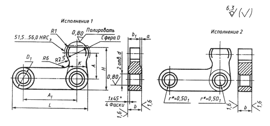 *В случае применения штифтов типа 1 по ГОСТ 3128 - поле допуска отверстия d-K7. Соответственно в условном обозначении указывать поле допуска К7. Пример условного обозначения углового рычага с двумя отверстиями исполнения 1, размерами А = 20мм, А1 = 40мм, с полем допуска диаметра d - H7: Рычаг 7018-0421 Н7 ГОСТ 12472-67 (Измененная редакция, Изм. № 1, 2). 2. Материал - сталь марки 40Х по ГОСТ 4543. Допускается замена на стали других марок с механическими свойствами не ниже, чем у стали марки 40Х. 3. Угловые рычаги с двумя отверстиями исполнения 1 изготавливать методом прецизионного литья. 4. Литейные радиусы - 3мм. 5. Твердость 36,5...41,5 HRCэ, кроме мест, обозначенных особо. (Измененная редакция, Изм. № 1, 2). 6. Неуказанные предельные отклонения