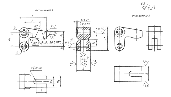 *В случае применения штифтов типа 1 по ГОСТ 3128-70-поле допуска отверстия d1-K7. Соответственно в условном обозначении указывать поле допуска К7. Пример условного обозначения углового двухпазового рычага исполнения 1, размером А = 32мм, с полями допусков диаметров d и d1-H11: Рычаг 7018-0501 ГОСТ 12475-67То же, с полями допусков диаметров d - Е8, dl - H11: Рычаг 7018-0501 Е8 НИ ГОСТ 12475-67(Измененная редакция, Изм. № 1, 2). 2. Материал - сталь марки 40Х по ГОСТ 4543-71. Допускается замена на стали других марок с механическими свойствами не ниже, чем у стали марки 40Х. 3. Рычаги угловые двухпазовые исполнения 1 изготавливать методом прецизионного литья. 4. Литейные радиусы - 3мм. 5. Твердость 36,5...41,5 HRCэ, кроме мест, обозначенных особо. (Измененная редакция, Изм. № 1, 2). 6. Неуказанные предельные