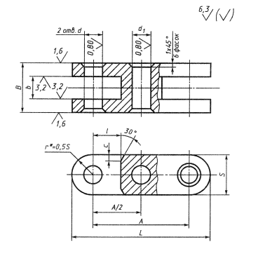 * В случае применения штифтов типа 1 по ГОСТ 3128 - поле допуска отверстия d-K7. Соответственно в условном обозначении указывать поле допуска К7. Пример условного обозначения вильчатого рычага размерами А-40мм, 6=10 мм, с полем допуска диаметров d и d1 - Н11: Рычаг 7018-0511 ГОСТ 12476-67То же, с полями допусков диаметра d - H7, d1 - E8: Рычаг 7018-0511 Н7 Е8 ГОСТ 12476-67(Измененная редакция, Изм. № 1, 2). 2. Материал - сталь марки 45 по ГОСТ 1050. Допускается замена на стали других марок с механическими свойствами не ниже, чем у стали марки 45. 3. Твердость - 36,5...41,5 HRCэ. 4. Неуказанные предельные
