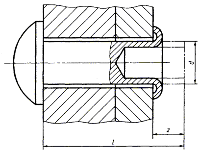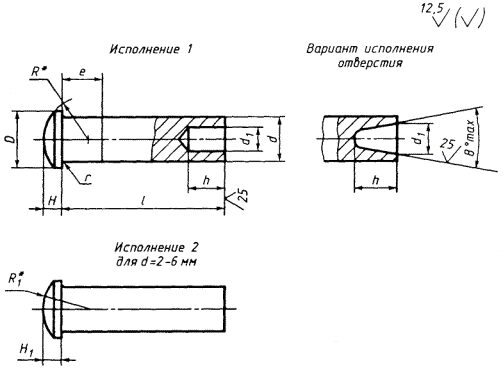 Примечание. Длины и диаметр заклепок, заключенные в скобки, применять не рекомендуется. Измененная редакция, Изм. № 2). 1.2. Отверстие в стержне заклепок может быть выполнено как сверлением, так и высадкой, форма дна отверстия не регламентируется. Пример условного обозначения полупустотелой заклепки с полукруглой головкой исполнения 1, диаметра d = 3 мм, длиной l = 20 мм из материала группы 01, из стали марки 10 без покрытия: Заклепка 3´20.01.10 ГОСТ 12641-80 1.3. Теоретическая масса заклепок указана в приложении 1. 1.4. (Исключен, Изм. № 2). 1.5. Длина стержня заклепки под замыкающую головку указана в приложении 3. (Введен дополнительно, Изм. № 2). 2. ТЕХНИЧЕСКИЕ ТРЕБОВАНИЯ2.1. Предельные отклонения диаметра d стержня