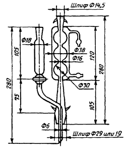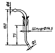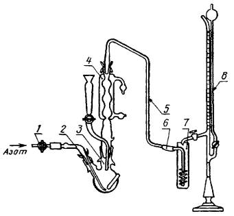 Дата введения 01.01.82 Настоящий стандарт устанавливает метод определения микропримесей серы, органически связанной в виде меркаптанов, сульфидов, дисульфидов, тиофена и его производных, а также элементарной серы и серы, входящей в состав сероводорода, в нефтепродуктах с бромным числом не более 10, не содержащих смолистых веществ. Сущность метода заключается в восстановлении органически связанной и элементарной серы на активном никеле Ренея до сульфида никеля, разложении сульфида никеля соляной кислотой и определении выделившегося сероводорода титрованием раствором ацетата ртути (в щелочной среде в присутствии индикатора дитизона). Метод предназначен для определения микропримесей серы в массовых долях от 0,2×10-4 до 25×10-3 %. При большем содержании серы пробы нефтепродукта соответственно разбавляют растворителями. (Измененная редакция, Изм. № 1,2). 1а. МЕТОД ОТБОРА ПРОБОтбор проб проводят по ГОСТ 2517. Пробу объемом не менее 100 см3 помещают в чистую сухую склянку, плотно закрывают пробкой из материала, исключающего наличие серы. Разд. 1а. (Введен дополнительно, Изм. № 1). 1. АППАРАТУРА, РЕАКТИВЫ И МАТЕРИАЛЫАппарат для определения микропримесей серы (черт. 1 - 7). Предельные отклонения линейных размеров ±10 мм, диаметров ±1 мм. Пипетка градуированная вместимостью 1 (2) см3 по ГОСТ 29227. Холодильник (черт. 3). Трубка стеклянная соединительная (черт. 4). Штуцер стеклянный (черт. 5). Колба двугорлая вместимостью 100 см3 из тугоплавкого стекла круглодонная (черт. 6) или с плоским дном (черт. 6а) с патрубком для термометра или без него. Абсорбер со змеевиком (черт. 7). Бюретка вместимостью 5 см3 и ценой деления 0,02 см3. Колбы 2-50-2, 2-100-2, 2-250-2, 2-500-2, 2-1000-2 по ГОСТ 1770. Цилиндр исполнения 1 (или 3) - 25 и 1 (или 3) - 100 по ГОСТ 1770. Колба Кн-1-10-14/23 ТС по ГОСТ 25336. Стакан В-1-250 ТС или Н-1-250 ТС по ГОСТ 25336. Термометр Тл-21-А4 или аналогичного типа. Общий вид установки 1 - стеклянный кран; 2 - штуцер (черт. 5); 3 - колба (черт. 6, 6а); 4 - холодильник (черт. 3); 5 - трубка (черт. 4); 6 - соединительная трубка; 7 - абсорбер (черт. 7); 8 - бюретка Черт. 1 Пипетка
