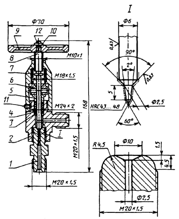 1 - резиновый баллон; 2 - винтовой зажим Черт. 2 Холодильник Черт. 3 Трубка Черт. 4 Штуцер Черт. 5 Колба Черт. 6 Колба Черт. 6а Абсорбер Черт. 7 Вентиль точной регулировки 1 - ниппель; 2 - корпус; 3 - кольцо; 4 - набивка; 5 - нажимная втулка; 6 - нажимная гайка; 7 - фонарь; 8 - шпиндель; 9 - маховик; 10 - шайба; 11 - стопорный винт, 12 - винт Черт. 8 Капельница 1-25 ХС или 2-25 ХС по ГОСТ 25336. Вентиль точной регулировки (черт. 8). Мешалка механическая стеклянная или магнитная с нагревом. Колбонагреватель. Автотрансформатор типа АОСН-8-220 У4. Баня водяная. Весы лабораторные общего назначения по ГОСТ 24104, 2-го класса точности с наибольшим пределом взвешивания 200 г и 3-го класса точности с наибольшим пределом взвешивания 500 г. Гири Г-2-210 по ГОСТ 7328. Трубки из поливинилхлоридного пластика по ГОСТ 19034 диаметром 6 - 8 мм или другие пластиковые трубки, не содержащие серу. Никель-алюминиевый сплав порошкообразный с массовой долей никеля 45 - 53 % и размерами частиц от 0,071 до 0,28 мм. Спирт этиловый ректификованный технический по ГОСТ 18300. Спирт изопропиловый (абсолютированный) по ГОСТ 9805. Ацетон по ГОСТ 2603, ч. д. а. Натрия гидроокись по ГОСТ 4328, ч. д. а., растворы 1,0 и 2,5 моль/дм3, готовят по ГОСТ 25794.1. Кислота соляная по ГОСТ 14261, раствор 1,5:1 (по объему). Ртути окись желтая по ГОСТ 5230, ч. д. а. Кислота уксусная ледяная по ГОСТ 61, х. ч. Дитизон, ч. д. а. Фенолфталеин. Вода дистиллированная по ГОСТ 6709. Азот газообразный по ГОСТ 9293 из баллона, газометра или системы, очищенный от кислорода пропусканием его через склянку с раствором 4 г гидроокиси калия в 10 см3 этиленгликоля, если массовая доля азота ниже 99,8 %. Сера техническая по ГОСТ 127.1 газовая или тиофен, чистоты 99,0 %. Бензол по ГОСТ 5955, х. ч. (для криоскопии). Бумага фильтровальная по ГОСТ 12026. Кран К1Х КШ-2-32-2,5 по ГОСТ 7995. Склянка 4-5 или 5-5 по ГОСТ 25336. Воронка В-75-140 ХС по ГОСТ 25336. Холодильник ХШ-1-300-29/32 ХС по ГОСТ 25336. Колба К-1-500-29/32 ТС по ГОСТ 25336. Секундомер. Электропечь, обеспечивающая нагрев до 200 °С. Изооктан эталонный, по ГОСТ 12433. Ступка 1 или 2 по ГОСТ 9147. Пестик 1 по ГОСТ 9147. Калия гидроокись по ГОСТ 24363. Этиленгликоль по ГОСТ 10164. Допускается применение аппаратуры с аналогичными техническими и метрологическими характеристиками, а также реактивов и материалов, в том числе и импортных, по качеству не ниже указанных в стандарте. Разд. 1. (Измененная редакция, Изм. № 1, 2). 2. ПОДГОТОВКА К ВЫПОЛНЕНИЮ ИЗМЕРЕНИЙ2.1. Приготовление активного никеля Ренея В стакан вместимостью 250 см3, помещенный в баню со льдом, наливают 100 см3 раствора гидроокиси натрия 2,5 моль/дм3. В охлажденный раствор в течение 5 - 7 мин высылают (10,0 ± 0,1) г никель-алюминиевого сплава при непрерывном перемешивании стеклянной мешалкой или вручную. При этом не должно быть бурного вспенивания и разогревания реакционной смеси выше 50 °С. Не вынимая стакана из ледяной бани, смесь перемешивают в течение 15 мин. Затем, оставив баню, продолжают перемешивание суспензии в течение 45 мин при комнатной температуре. Смесь отстаивают в течение 1,0 - 1,5 мин, раствор щелочи сливают и активный никель Ренея быстро промывают свежеперегнанной и охлажденной до комнатной температуры дистиллированной водой методом декантации до нейтральной реакции по фенолфталеину (для этого требуется 20 - 25-кратное промывание водой порциями по 50 см3). Далее активный никель Ренея дважды промывают 10 см3 этилового и 10 см3 изопропилового спирта и заливают изопропиловым спирт