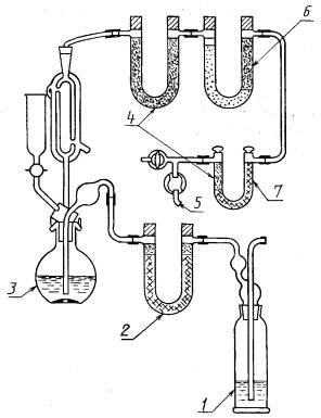 (Измененная редакция, Изм. № 1). 2.4.2. Содержание диоксида углерода карбонатов определяют параллельно в двух навесках аналитической пробы испытуемого топлива. За результат принимают среднеарифметическое результатов двух параллельных определений в пределах допускаемых расхождений. 2.5. Точность метода - по п. 1.8. 2.6. Если расхождение между результатами двух параллельных определений превышает допускаемое, производят третье определение и за окончательный результат принимают среднеарифметическое результатов двух наиболее близких определений в пределах допускаемых расхождений. Если результат третьего определения находится в пределах допускаемых расхождений по отношению к результатам каждого из двух предыдущих определений, за результат принимают среднеарифметическое результатов трех определений. 2.7. Пересчет данных на другие состояния топлива - по ГОСТ 27313. ПРИЛОЖЕНИЕ 1Обязательное 1. ПОРЯДОК ПОДГОТОВКИ И ЗАПОЛНЕНИЯ U-ОБРАЗНЫХ ТРУБОК ПОГЛОТИТЕЛЯМИ1.1. Заполнение U-образных трубок натронной известью, аскаритом или натронным асбестом U-образные трубки предварительно промывают и на их соединительные отростки надевают резиновые трубки со вставленными в них стеклянными палочками. Внутри U-образных трубок перед соединительными отростками помещают небольшой слой ваты. После этого U-образные трубки заполняют не слишком плотно на 2/3 их объема аскаритом или натронной известью, смешанной с индикатором щелочным голубым (на 100 г извести берут 0,25 г индикатора), а остальную часть трубок - хлористым кальцием или ангидроном. Между аскаритом или натронной известью и хлористым кальцием или ангидроном помещают слой ваты. Затем концы U-образных трубок закрывают слоем ваты и стеклянными пришлифованными или резиновыми пробками. 1.2. Заполнение U-образных трубок хлористым кальцием и ангидроном Подготовку трубок, наполнение их хлористым кальцием или ангидроном производят, как указано в п. 1.1. Для нейтрализации возможной щелочности хлористого кальция и ангидрона через трубки, наполненные указанными реактивами, пропускают в течение 3 ч сухой диоксид углерода. Закрывают соединительные отростки и оставляют трубки наполненными диоксидом углерода в течение суток. Затем через трубки в течение 6 ч пропускают сухой воздух. 1.3. Заполнение U-образных трубок пемзой, пропитанной насыщенным раствором сернокислой меди или фосфатом меди Подготовку трубок, наполнение их пемзой производят, как указано в п. 1.1. Пемзу измельчают до размера зерен 1,5 мм. Отсеивают класс размером 0 - 0,6 мм, а класс с размером зерен 0,6 и 1,5 мм кипятят в растворе соляной кислоты (1:1) для удаления щелочных соединений и промывают водой до отрицательной реакции на ионы хлора. После этого пемзу прокаливают в муфеле 1 - 1,5 ч при температуре от 700 до 800 °С. Прокаленную пемзу помещают в фарфоровый тигель или чашку, заливают насыщенным раствором сернокислой меди, нагревают до кипения и при постоянном перемешивании раствор осторожно выпаривают досуха, пемзу просушивают при температуре 150 - 160 °С в течение 2 ч и помещают в эксикатор. Подготовку трубки 6 производят, как указано в п. 1.1. Заполняют трубку до половины обеих ветвей пемзой, насыщенной безводной сернокислой медью или гранулированной фосфорнокислой медью. Остальную часть заполняют ангидроном или хлористым кальцием. Аппараты помещают в гнезда с