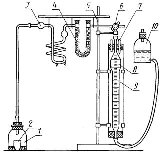 1.8.2. Воспроизводимость Среднеарифметическое результатов двух определений, полученных в двух разных лабораториях на представительных навесках, взятых из одной и той же пробы на последней стадии приготовления пробы, не должно превышать значений, указанных в табл. 1 и 1а. 1.8.1, 1.8.2. (Измененная редакция, Изм. № 1). 1.9. Протокол испытания Протокол испытания должен включать следующие данные: ссылку на используемый метод; результаты и методы их выражения; особенности, отмеченные в процессе определения; любые операции, не предусмотренные настоящим стандартом или считающиеся необязательными. 2. УСКОРЕННЫЙ ОБЪЕМНЫЙ МЕТОД ОПРЕДЕЛЕНИЯ ДИОКСИДА УГЛЕРОДА КАРБОНАТОВМетод основан на разложении карбонатов соляной кислотой и определении объема выделившегося при этом диоксида углерода. 2.1. Аппаратура, материалы и реактивы Установка для определения содержания диоксида углерода карбонатов (черт. 2), в которую входят следующие элементы: реакционная склянка; фарфоровый тигель высокой формы № 3 по ГОСТ 9147; спиральный прибор; U-образная трубка; металлический штатив; трехходовой кран по ГОСТ 7995; ртутный термометр с измерениями от 0 до 50 °С; газоизмерительная бюретка вместимостью 100 см3 из комплекта газоанализатора типа ГХП-2 или ГХП, изготовленная по образцу указанных типов; стеклянный цилиндр (водяная рубашка, служащая для охлаждения бюретки); уравнительная склянка вместимостью 300 см3. Барометр метеорологический. Весы аналитические с погрешностью взвешивания до 0,5 мг. Трубки резиновые внутренним диаметром 3 - 5 мм и толщиной стенок не более 2 мм по ГОСТ 5496. Трубки стеклянные диаметром 5 - 6 мм. Пробки резиновые по ГОСТ 7338. Кислота соляная по ГОСТ 3118, х.ч. или ч.д.а., разбавленная 1:1. Кислота серная по ГОСТ 4204, х.ч. или ч.д.а. r 1,83 г/см3, 10 %-ный раствор. Медь сернокислая по ГОСТ 4165, х.ч. или ч.д.а. Пемза с размерами зерен 2 - 3 мм. Кальций хлористый (двуводный) ч.д.а. или ч., свежеприготовленный, с размерами зерен 1 - 2 мм. Метиловый оранжевый (индикатор) 0,5 %-ный раствор. Вода дистиллированная по ГОСТ 6709. Установка для ускоренного метода определения диоксида углерода 1 - реакционная склянка; 2 - фарфоровый тигель; 3 - спиральный прибор; 4 - U-образная трубка; 5 - металлический штатив; 6 - трехходовой кран; 7 - ртутный термометр; 8 - газоизмерительная бюретка; 9 - цилиндр; 10 - уравнительная склянка Примечание. Взамен спирального прибора с серной кислотой для поглощения влаги допускается использовать U-образную трубку с ангидроном (п. 1.3.3). Взамен U-образной трубки с поглотителем сульфида водорода допускается добавлять сернокислую медь непосредственно в реакционную склянку к навеске. (Измененная редакция, Изм. № 1). 2.2. Подготовка к испытанию 2.2.1. Спиральный прибор заполняют на 1/3 объема серной кислотой плотностью 1,83 - 1,84 г/см3. 2.2.2. U-образную трубку наполняют пемзой, пропитанной насыщенным раствором сернокислой меди. 2.2.3. Порядок заполнения поглотительных аппаратов реактивами и их смена указаны в приложении. 2.2.4. Уравнительную склянку с тубусом и плотно пригнанной резиновой пробкой, в которую вставлена оплавленная с концов стеклянная трубка, заполняют 10 %-ным раствором серной кислоты (запирающая жидкость). В раствор добавляют 3 - 4 капли 0,5 %-ного раствора метилового оранжевого. 2.2.5. Водяную рубашку бюретки сверху закрывают резиновой пробкой с тремя отверстиями: в одно отверстие вставляют верхнюю от