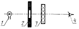 При прессовании используют прокладки из алюминиевой фольги. Пресс-форму с навеской полимера помещают на плиту пресса, нагретую до температуры, указанной в табл. 3, и выдерживают при этой температуре до полного расплавления полимера в течение времени, указанного в табл. 3. После этого создают давление в пресс-форме, указанное в табл. 3. Затем отключают обогрев и выдерживают под давлением при естественном охлаждении до температуры 210 - 220 °С, снимают давление, пресс-форму с пластиной быстро опускают в ванну с проточной водой и распрессовывают вручную. Температуру плит пресса измеряют термоэлектрическим преобразователем. 3.3.5. Перед вырубкой образцов пластину предварительно прогревают в термостате при температуре (100 ± 5) °С в течение (15 ± 3) мин. Из пластин вырубают штанцевыми ножами образцы для физико-механических испытаний и для определения температуры потери прочности. 3.4. Перед проведением физико-механических испытаний образцы кондиционируют по ГОСТ 12423-66 не менее 1 ч на воздухе при температуре (23 ± 2) °С и ненормированной влажности. 3.5. Определение внешнего вида пластины Цвет пластины из фторопласта-3 определяют в отраженном свете сравнением с пластиной-образцом, согласованным с потребителем и утвержденным в установленном порядке. Пластины при испытании помещают на лист белой бумаги. Чистоту пластины сравнивают с образцом, согласованным с потребителем и утвержденным в установленном порядке. Испытание проводят в проходящем свете, создаваемом лампой мощностью 100 Вт или с помощью лампового дефектоскопа. Образец помещают по отношению к источнику света по схеме, указанной на черт. 1. Определение внешнего вида пластины проводят на одной пластине перед вырубкой из нее образцов для физико-механических испытаний. За результат определения принимают оценку соответствия цвета и чистоты пластины, указанным в табл. 1, подпункт 2. 1 - источник света, 2 - непрозрачный экран с отверстием, 3 - образец, 4 - глаз контролера. 3.6. Определение остатка после просева на сите с сеткой № 05К 3.6.1. Аппаратура Весы лабораторные общего назначения 4-го класса точности по ГОСТ 24104-80 с наибольшим пределом взвешивания 500 г. Сито с сеткой № 05К по ГОСТ 6613-86. 3.6.2. Проведение испытания (100 ± 1) г фторопласта-3 и сито взвешивают отдельно и результат взвешивания записывают с точностью до первого десятичного знака. Порошок просеивают через сито, встряхивая и протирая. Затем сито с остатком порошка взвешивают и результат записывают с той же точностью. 3.6.3. Обработка результатов Остаток после просева на сите (X1) в процентах вычисляют по формуле